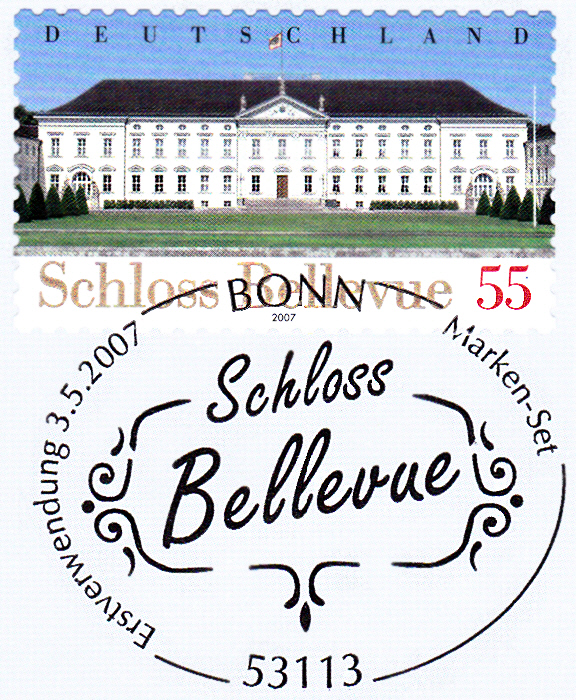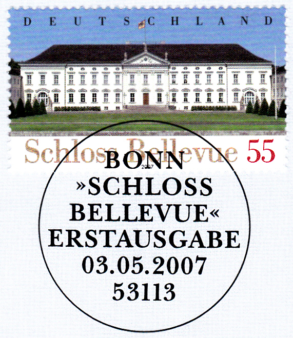 Diese Marke der Deutschen Post AG mit dem Schloss Bellevue (MiNr 2601) wurde mit dem Ersttagsonderstempel Bonn entwertet.