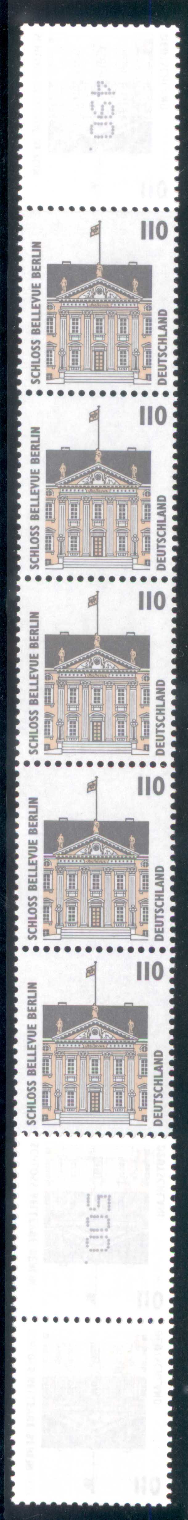 Postfrischer, gefalteter 11er-Streifen vom Anfang einer 500er-Rolle des 110 Pfennig Wertes der Dauerserie Sehenswürdigkeiten mit dem Motiv Schloss Bellevue (MiNr 1935):