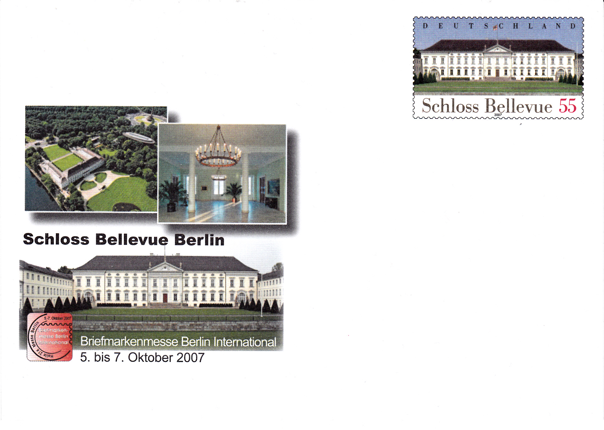 Zur Briefmarkenmesse Berlin gab es 2007 einen Sonderumschlag (MiNr USo 139) mit einem Wertstempel der bereits hier gezeigten Marke "Schloss Bellevue - Amtssitz des Bundespräsidenten" (MiNr 2601).