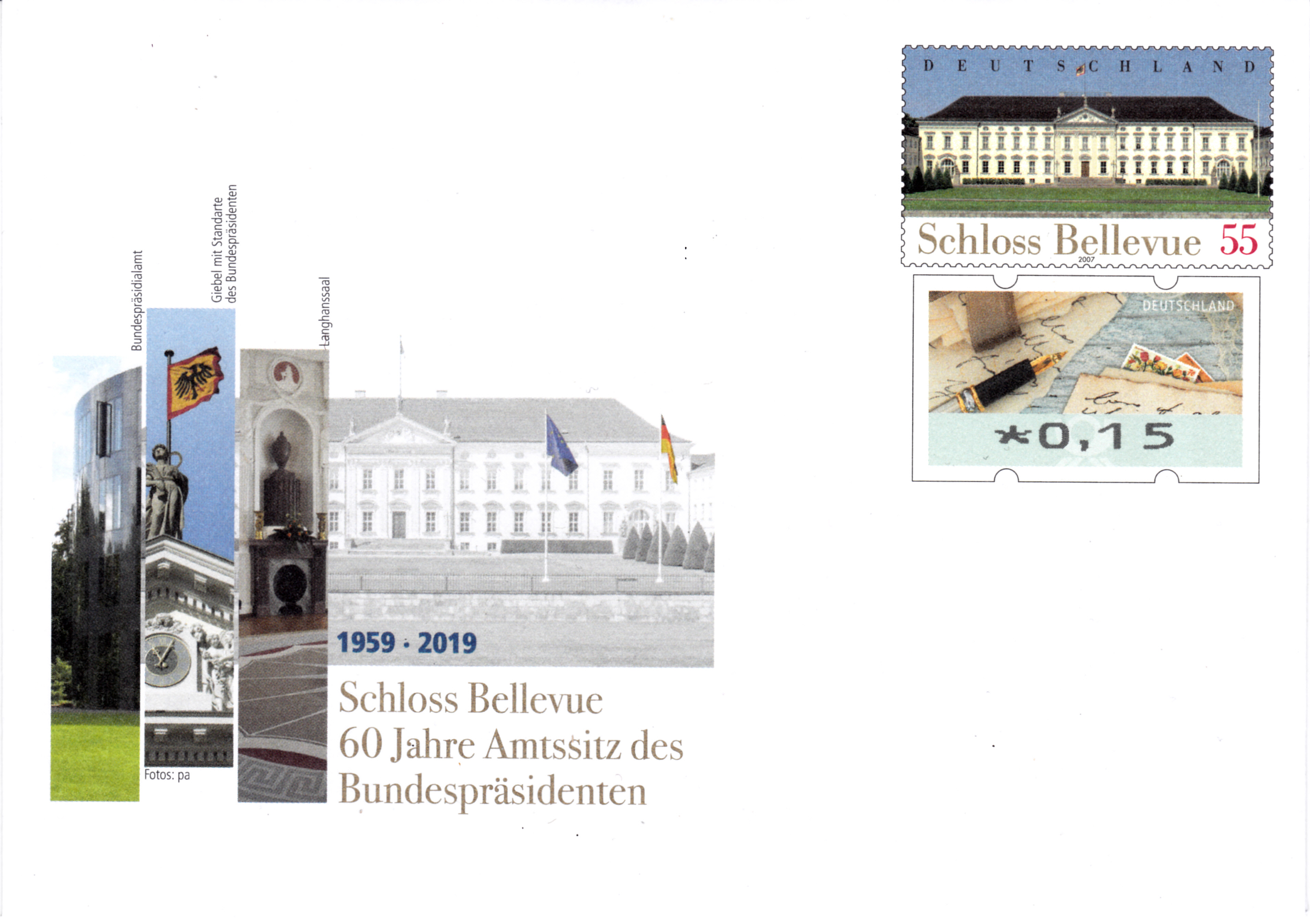Auch bei dieser Gedenkganzsache "60 Jahre Amtssitz des Bundespräsidenten" wurde der Wertstempel "Schloss Bellevue - Amtssitz des Bundespräsidenten" verwendet und ein zusätzlicher Wertstempel im Muster einer Automatenmarke zu 15 Cent.
