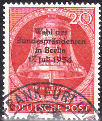 Zur Wahl des Bundespräsidenten erschien bei der LPD Berlin eine Neuauflage der 20Pf-Marke "Freiheitsglocke, Klöppel in der Mitte" mit Bdr.-Aufdruck "Wahl des Bundespräsidenten in Berlin 17. Juli 1954".