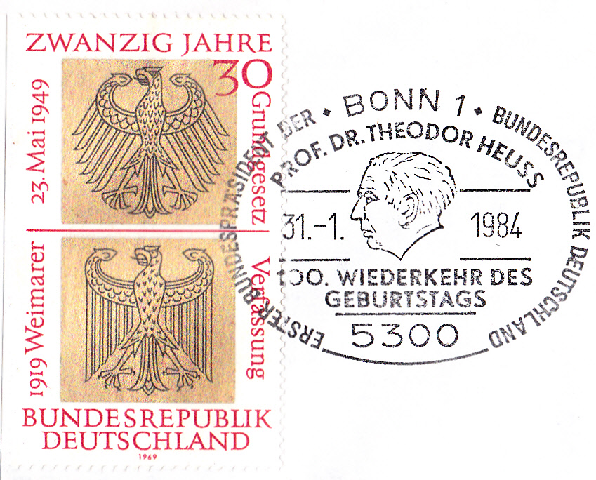 Sonderstempel vom 31.1.1984 aus Bonn zum 100. Geburtstag von Theodor Heuss auf einem Brief mit Eilzustellung. Das Porto betrug 80Pf für einen Brief bis 20g und 350Pf für die Eilzustellung, zusammen also 430Pf. Zur Frankatur wurde zum Thema passend der Block mit den fünf Marken zu je 80Pf mit den Bundespräsidenten (MiNr Block 18) und die Marke "20 Jahre Bundesrepublik Deutschland" (MiNr 585) zu 30Pf.