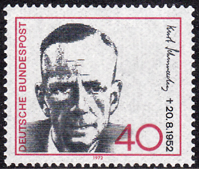 Zum 20. Todestag von Jurt Schumacher ist bei der Deutschen Bundespost 1972 diese Marke (MiNr 738) mit seinem Porträt, seiner Unterschrift und der Angabe seines Todestages erschienen.