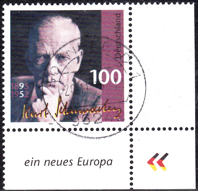 Zum 100. Geburtstag von Kurt Schumacher ist bei der Deutschen Post AG im Jahre 1995 eine weitere Marke (MiNr 1824) mit einem Porträt von Kurt Schumacher erschienen. Hier eine Eckrandstück dieser Marke.