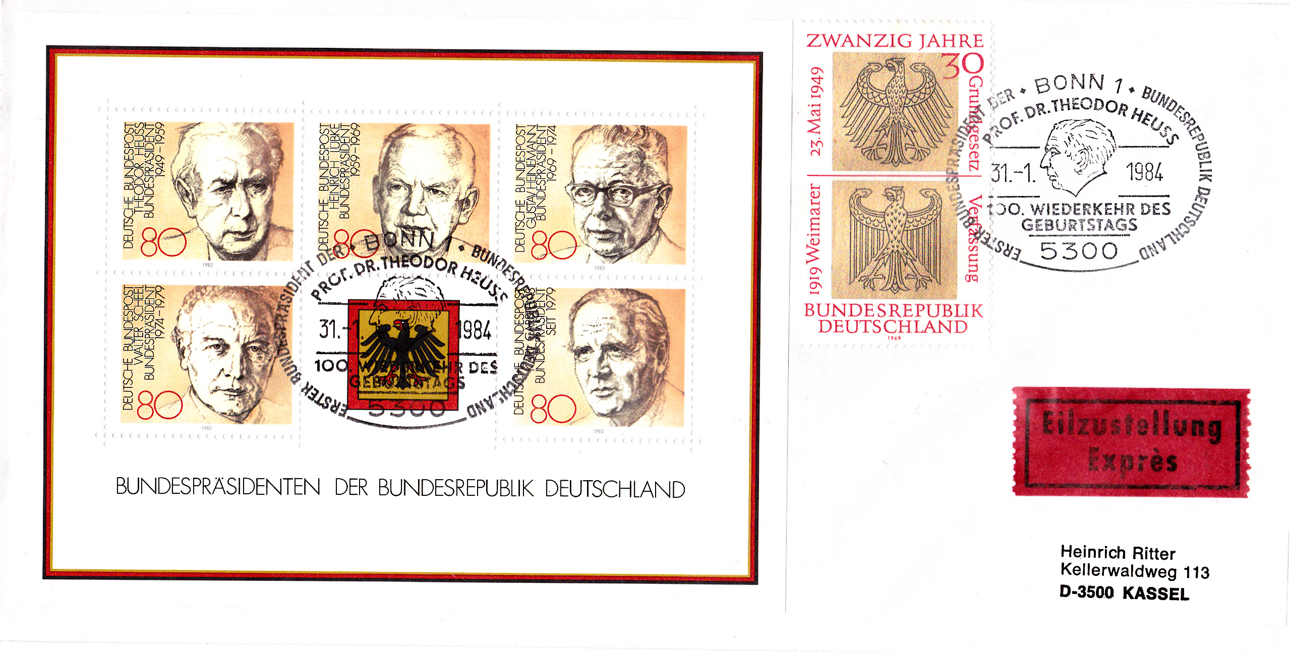 Sonderstempel vom 31.1.1984 aus Bonn zum 100. Geburtstag von Theodor Heuss auf einem Brief mit Eilzustellung. Das Porto betrug 80Pf für einen Brief bis 20g und 350Pf für die Eilzustellung, zusammen also 430Pf. Zur Frankatur wurde zum Thema passend der Block mit den fünf Marken zu je 80Pf mit den Bundespräsidenten (MiNr Block 18) und die Marke "20 Jahre Bundesrepublik Deutschland" (MiNr 585) zu 30Pf.