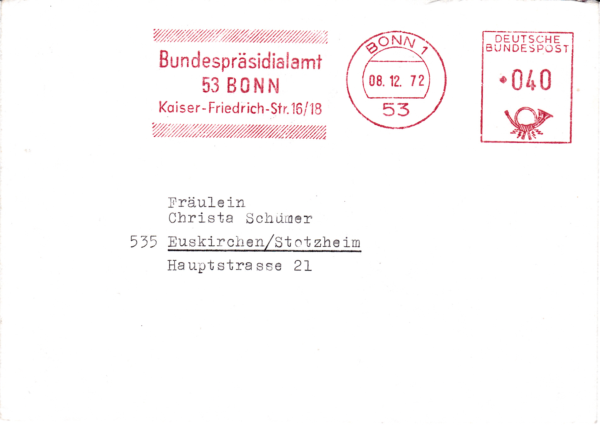 Dieser Brief mit einem Absenderfreistempel "Bundespräsidialamt 53 Bonn" wurde am 8.12.1972 (also bereits in der Amtszeit von Bundespräsident Heinemann) von der Witwe Wilhelmine Lübke verschickt.