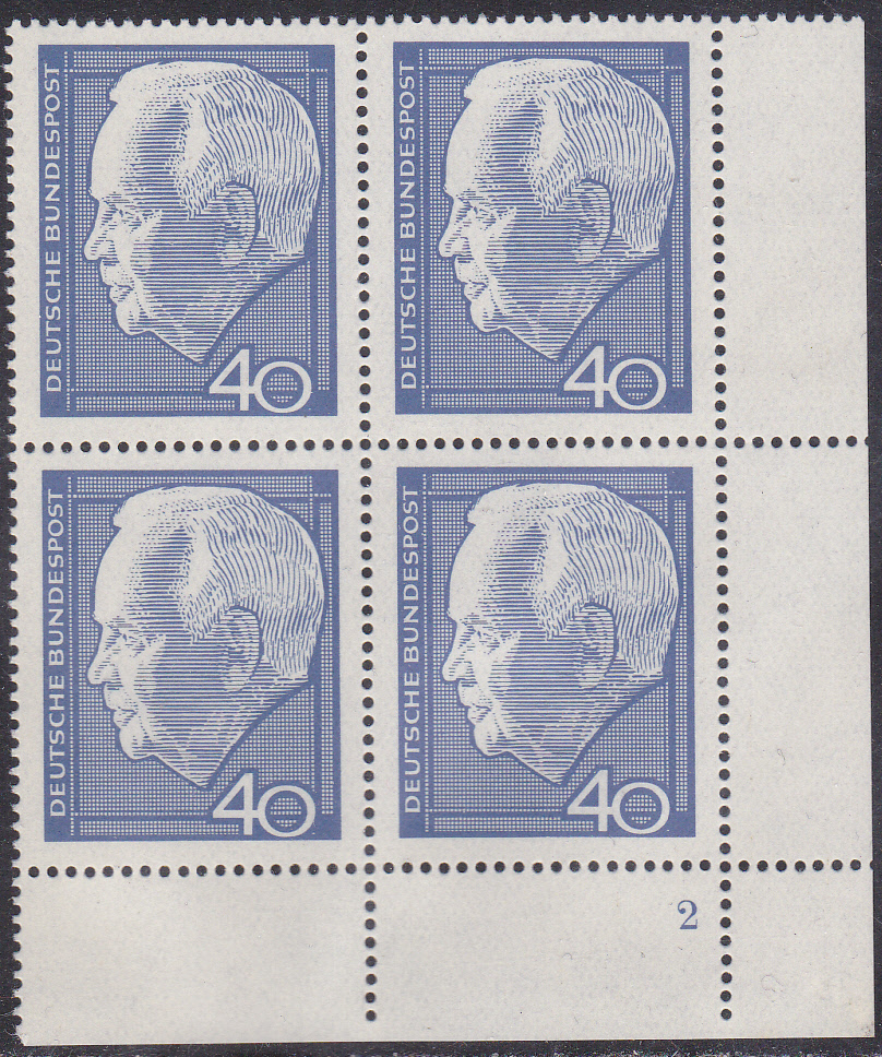 Am 1. Juli 1964 wurde Lübke von der 4. Bundesversammlung zu seiner 2. Amtszeit wiedergewählt. Dazu erschien am 1. Juli 1964 eine Sondermarkenausgabe. Hier die Marke zu 20Pf (MiNr 429) als Eckrandviererblock mit der Formnummer "1".