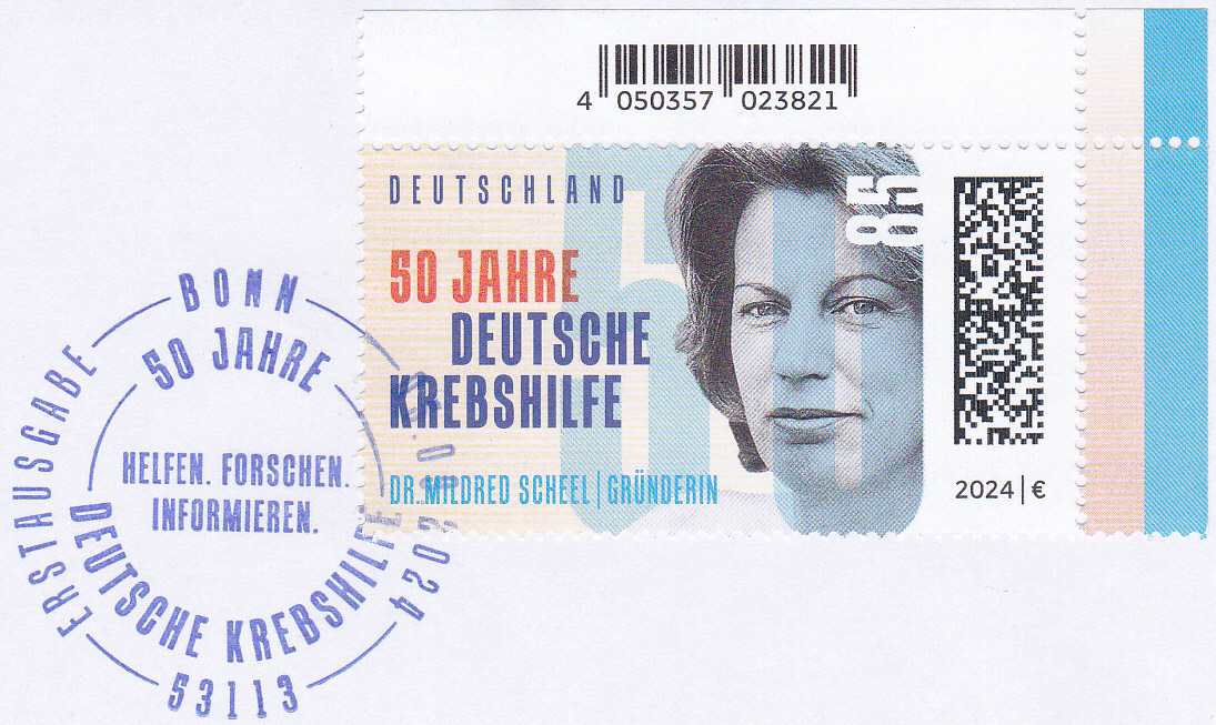Zum Jubiläum "50 Jahre Deutsche Krebshilfe" erschien bei der Deutschen Post eine Marke (MiNr 3853) mit ihrem Porträt.