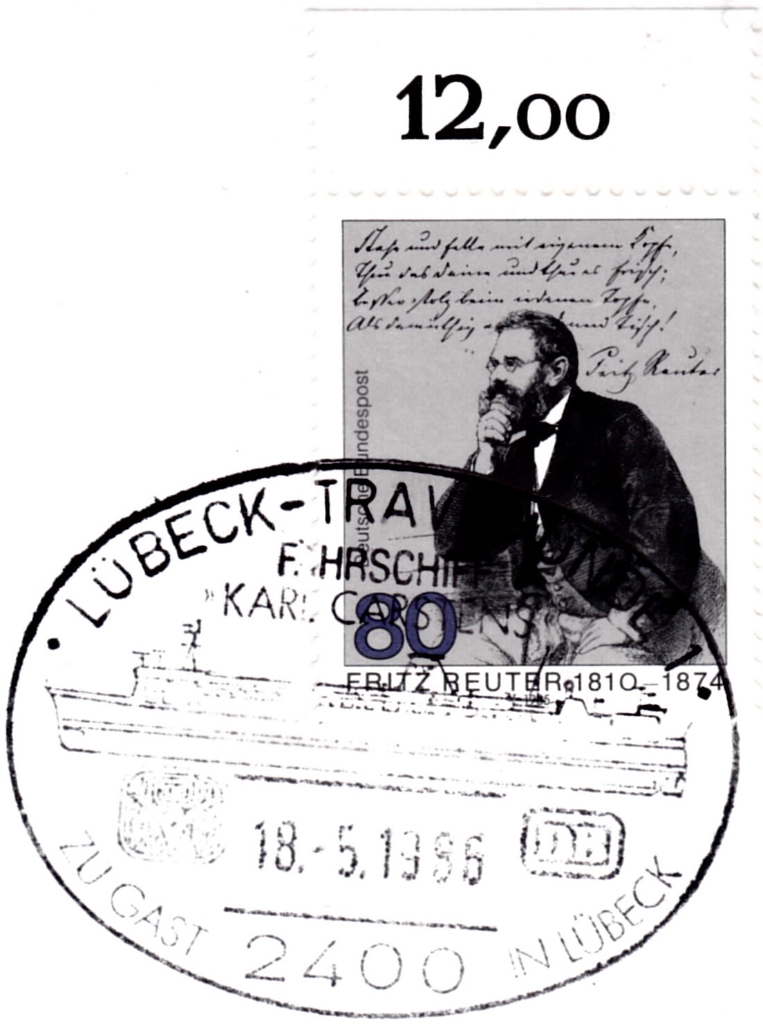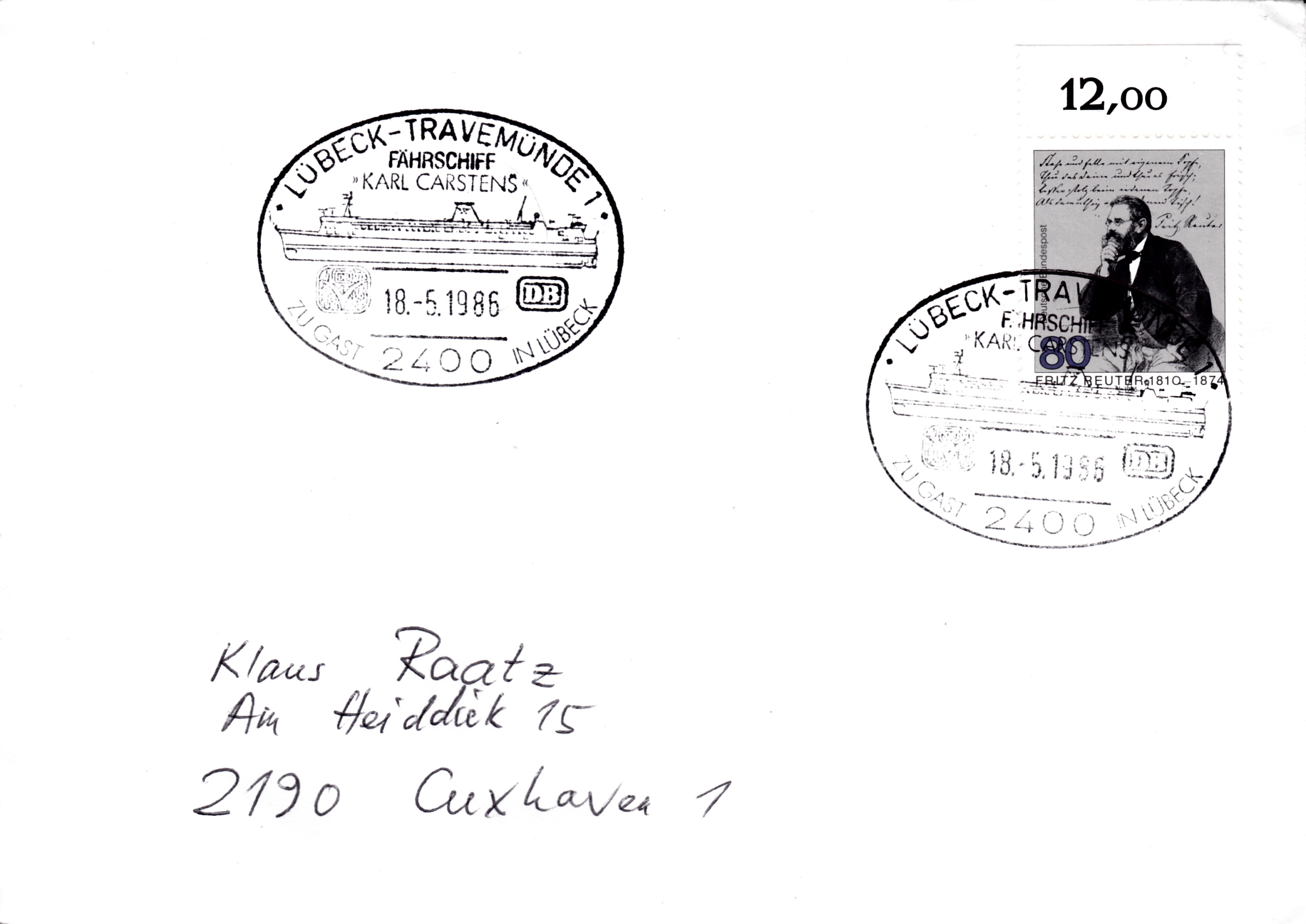 Dieser Sonderstempel aus Lübeck-Travemünde vom 18.5.1986 zeigt das Fährschiff "Karl Carstens" im Stempelbild.