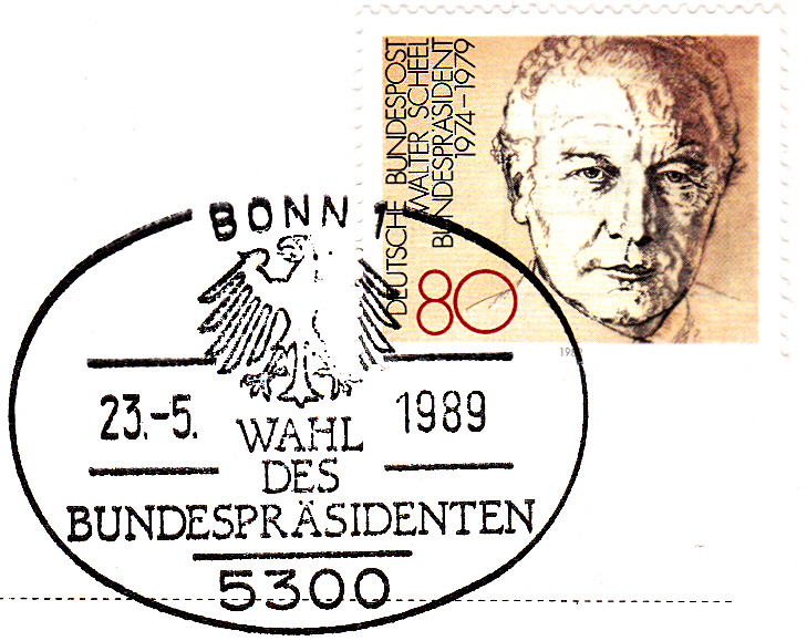 Am 23. Mai 1989 hat die Bundesversammlung Richard von Weizäcker zu seiner 2. Amtsperiode als Bundespräsident wiedergewählt. Bei dieser "Wahl" gab es nur einen Kandidaten. Hier der Sonderstempel aus Bonn vom 23.5.1989 zur Wahl des Bundespräsidenten.