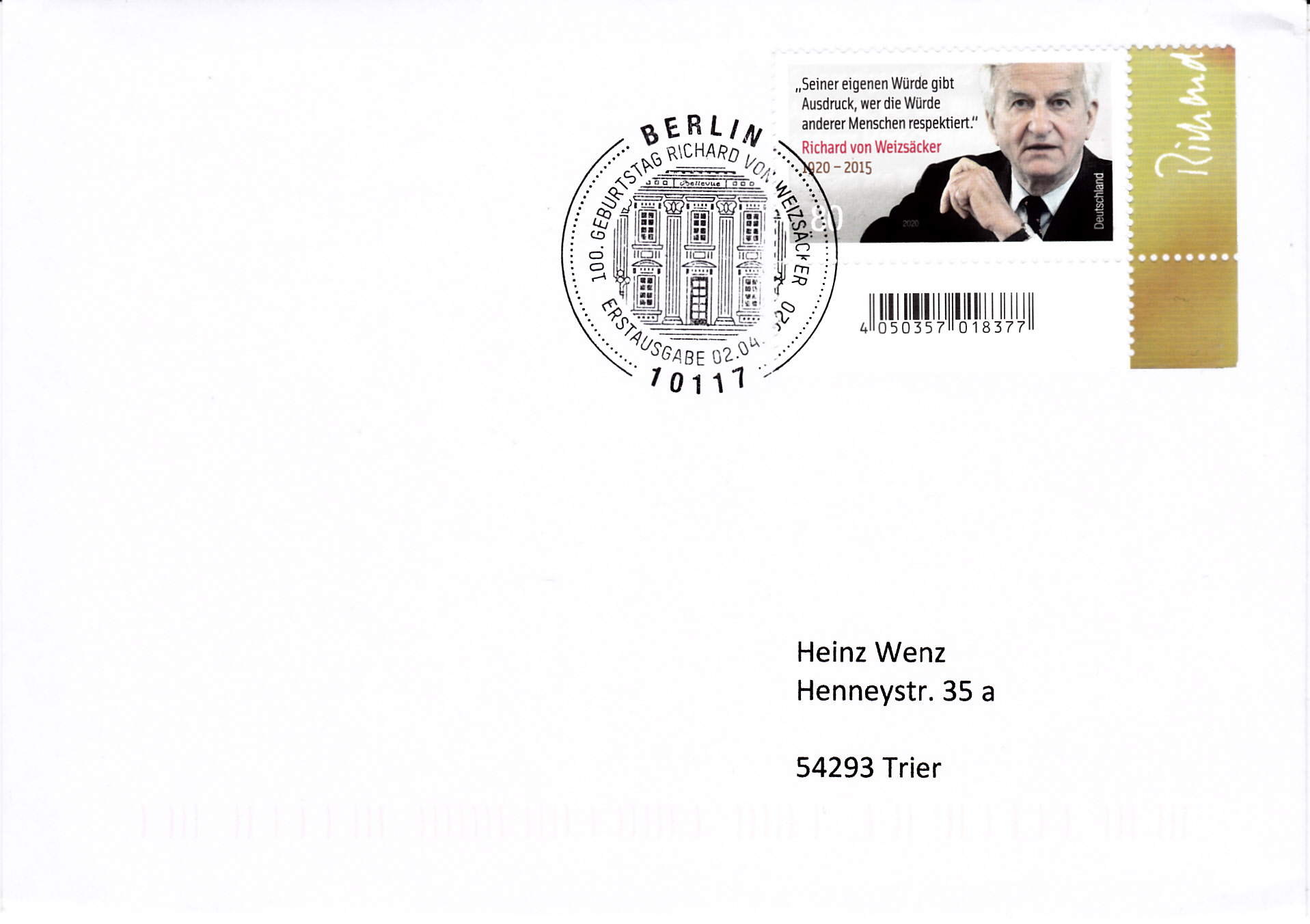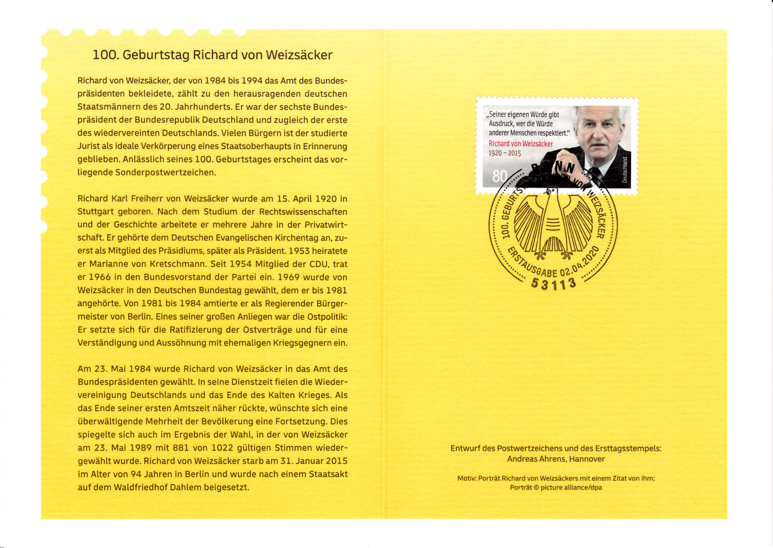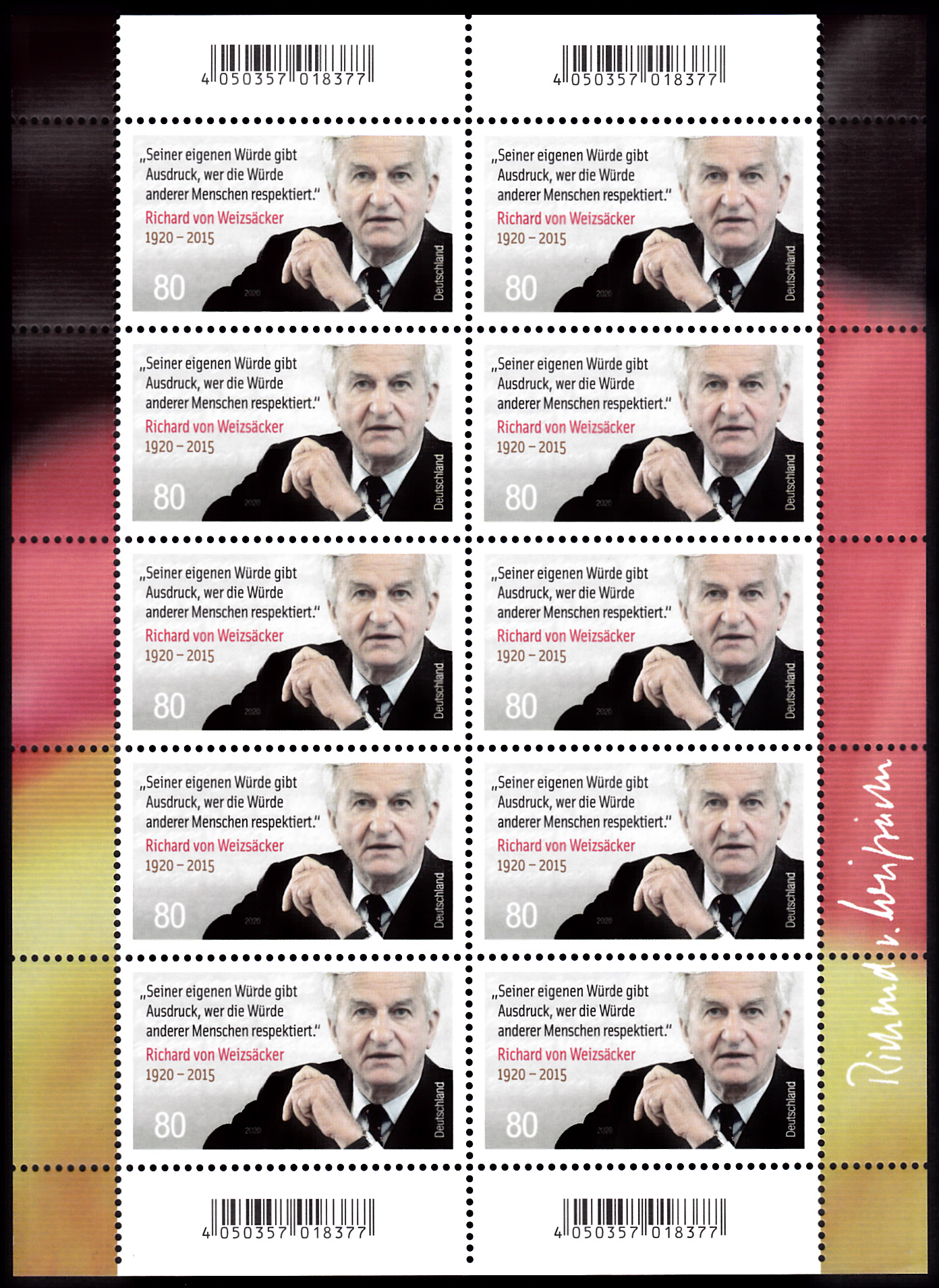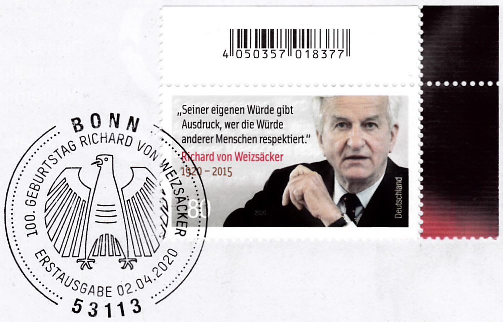 Zum 100. Geburtstag von Richard von Weizsäcker ist bei der Deutschen Post eine Marke (MiNr 3539) mit seinem Porträt und einem Zitat erschienen.