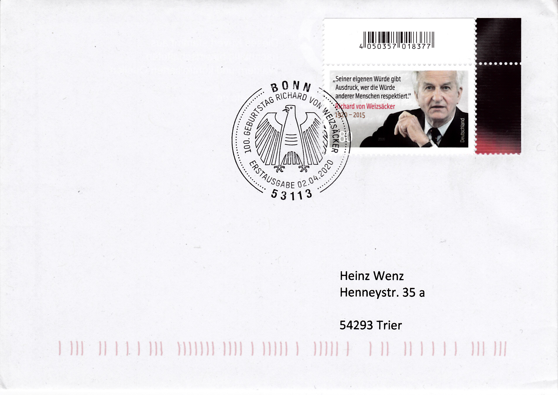 Brief mit der Marke 100. Geburtstag von Richard von Weizsäcker (MiNr 3539) mir dem Ersttagsonderstempel aus Bonn. Im Stempelbild wird ein Bundesadler gezeigt.
