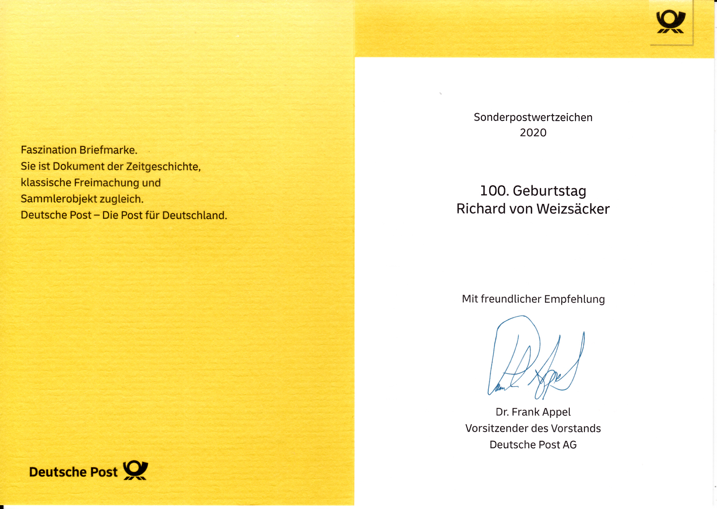 Klappkarte des Vorstandsvorsitzenden der Deutschen Post AG mit der Marke zum 100. Geburtstag von Richard von Weizsäcker (MiNr 3539) und dem Ersttagsonderstempel Bonn.