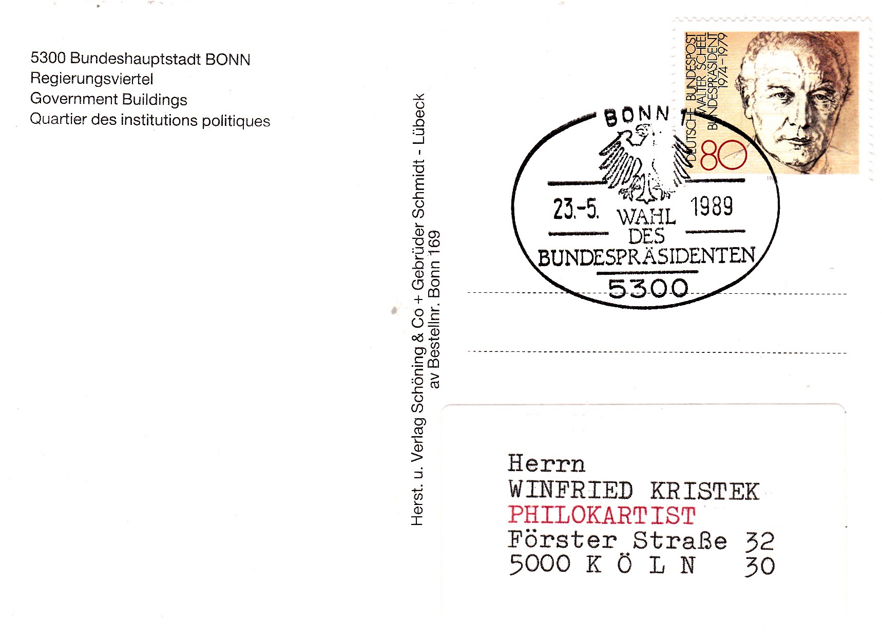 Am 23. Mai 1989 hat die Bundesversammlung Richard von Weizäcker zu seiner 2. Amtsperiode als Bundespräsident wiedergewählt. Bei dieser "Wahl" gab es nur einen Kandidaten. Hier der Sonderstempel aus Bonn vom 23.5.1989 zur Wahl des Bundespräsidenten.
