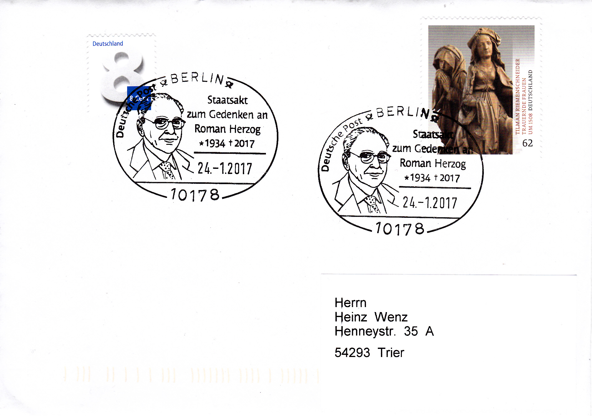 Sonderstempel aus Berlin vom 24.1.2017 zum Staatsakt für Roman Herzog. Im Stempel ist ein Porträt von Roman Herzog zu sehen.