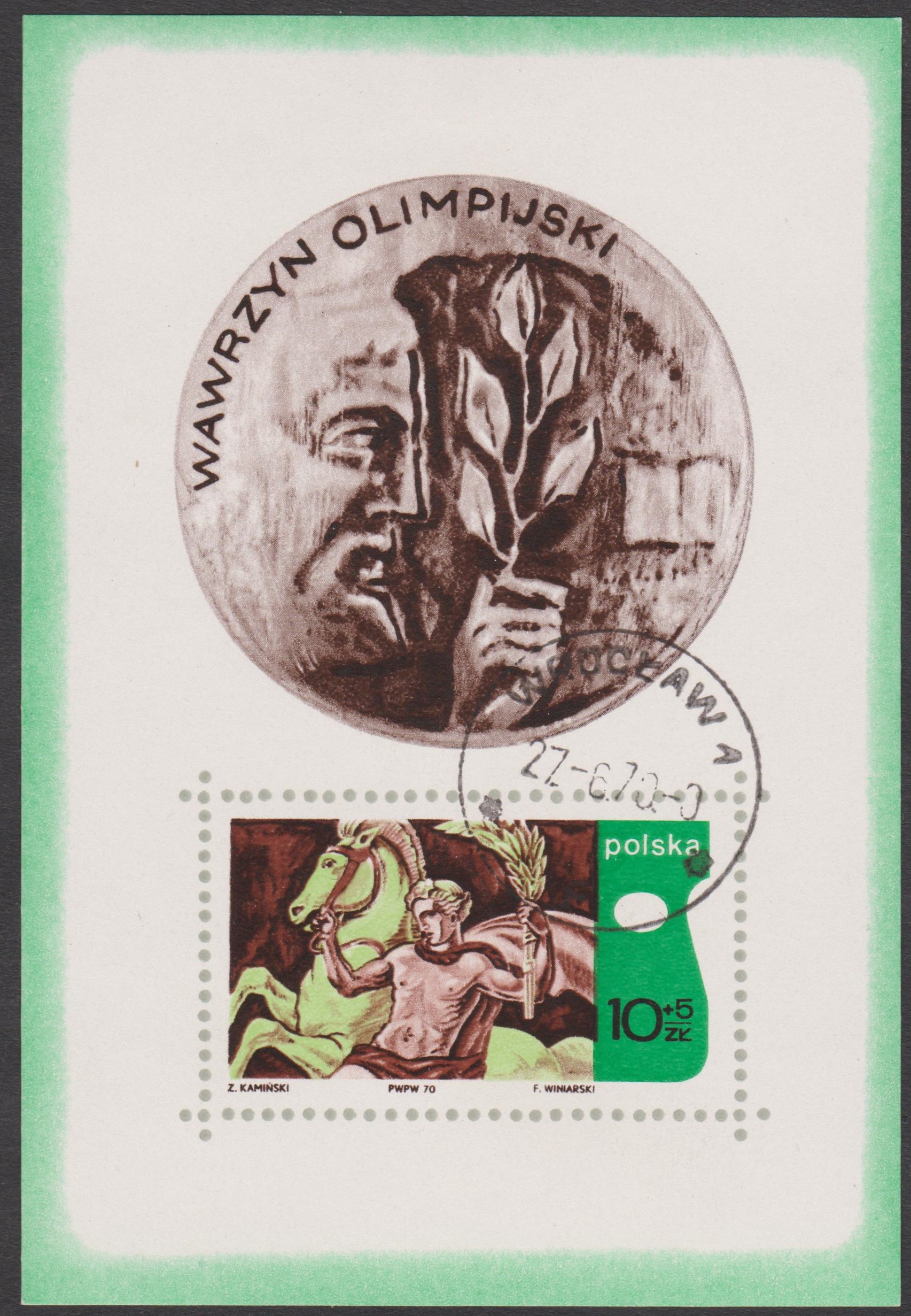 Polen MiNr. 2013 = Block 41 zeigt "Das Ruhmespferd", eine Vignettenzeichnung von Zygmunt Kamiński (22 November 1888 – 12 October 1969) aus dem Kunstwettbewerb im Rahmen der Sommerolympiade 1928: