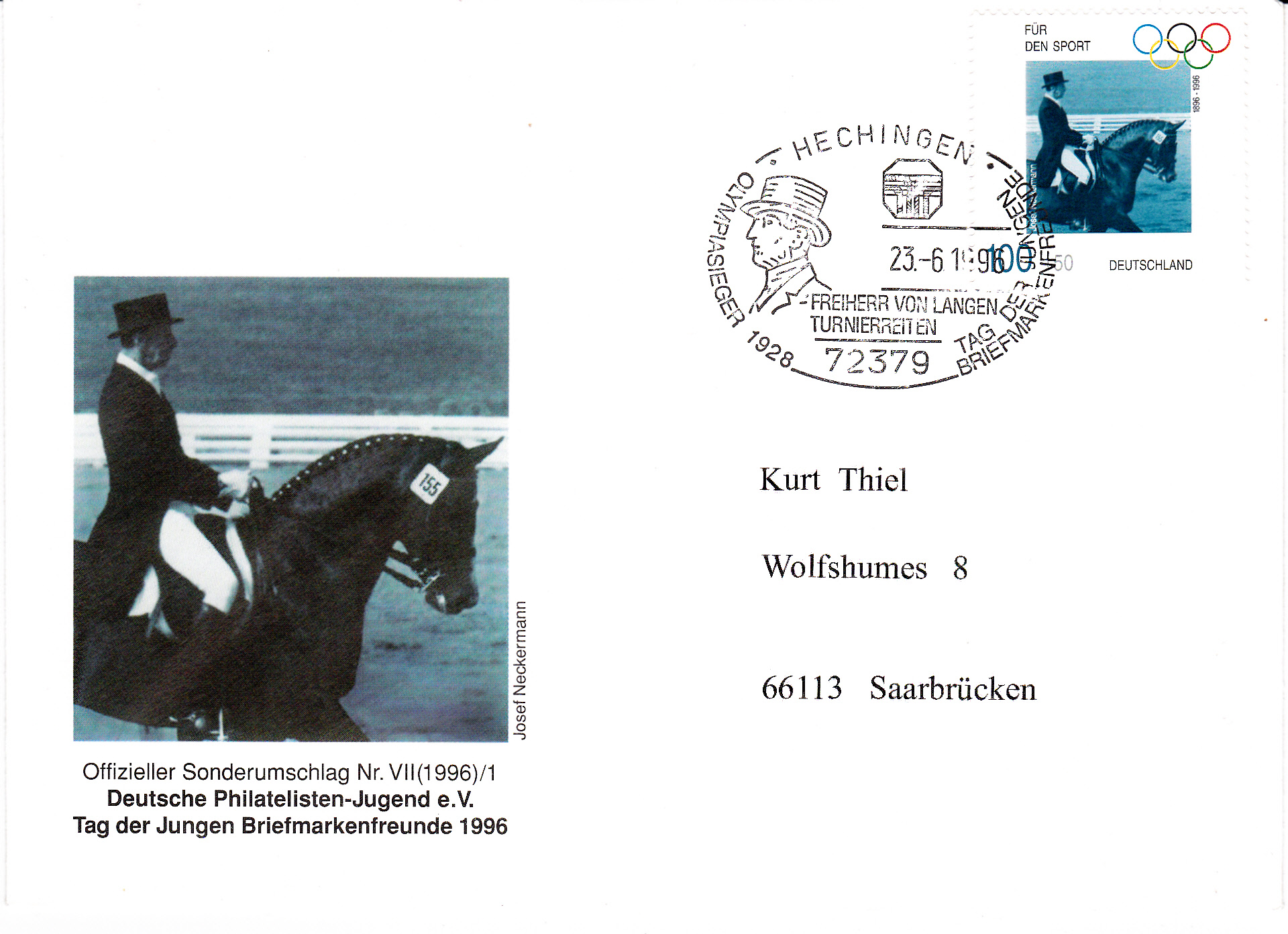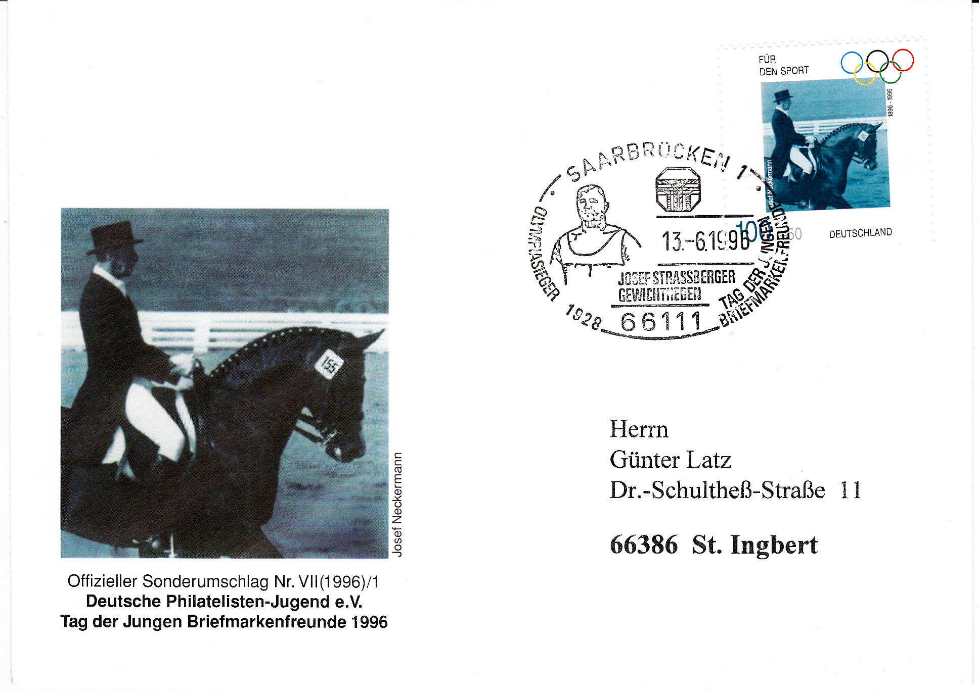 Der Stempel zum Tag der Jungen Briefmarkenfreunde aus Saarbrücken vom Ersttag der Olympiamarken 1996 zeigt Josef Straßberger im Stempelbild.