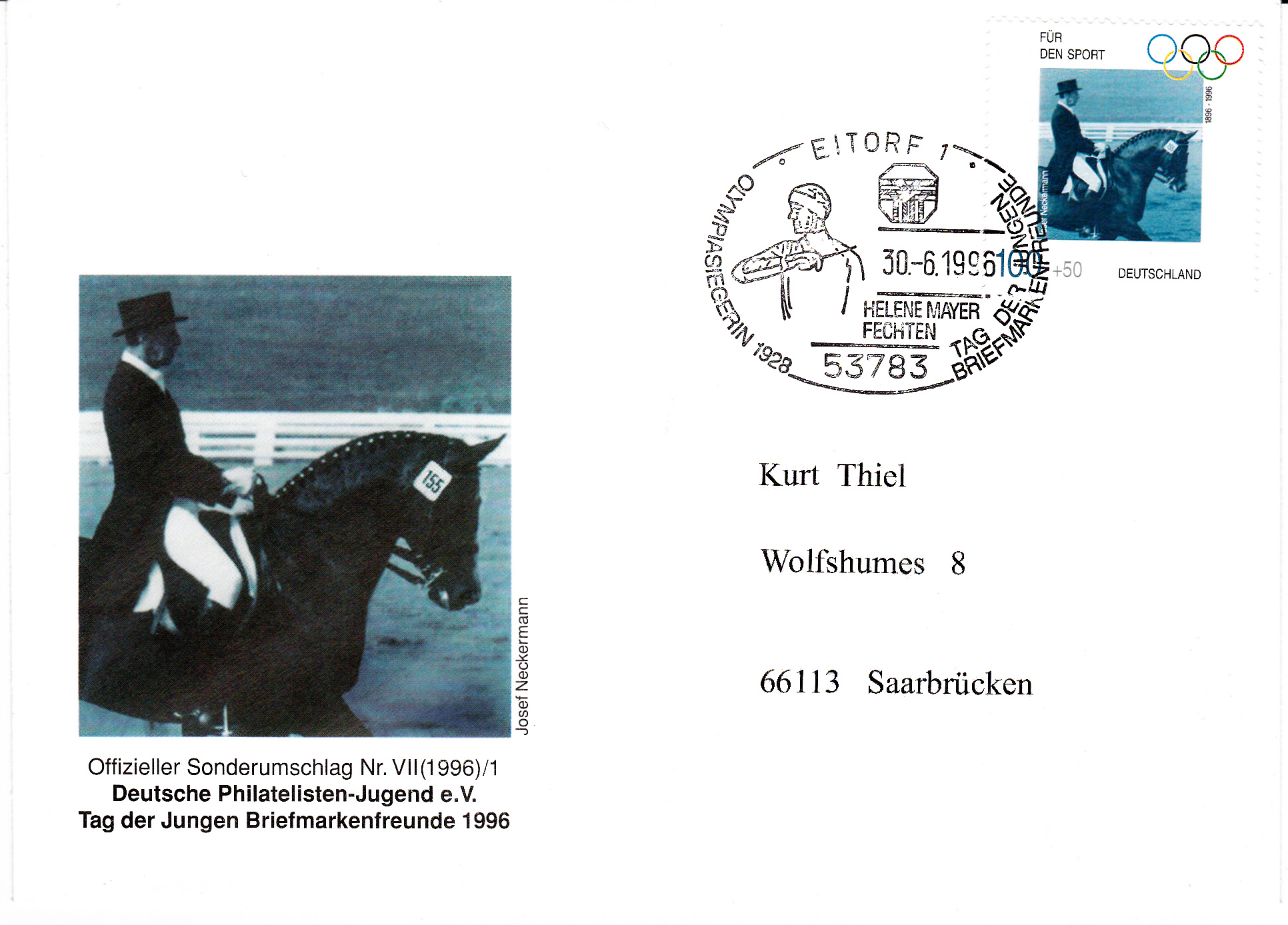 Der Stempel zum Tag der Jungen Briefmarkenfreunde aus Eitorf vom 30.6.1996 zeigt Helene Meyer im Stempelbild.