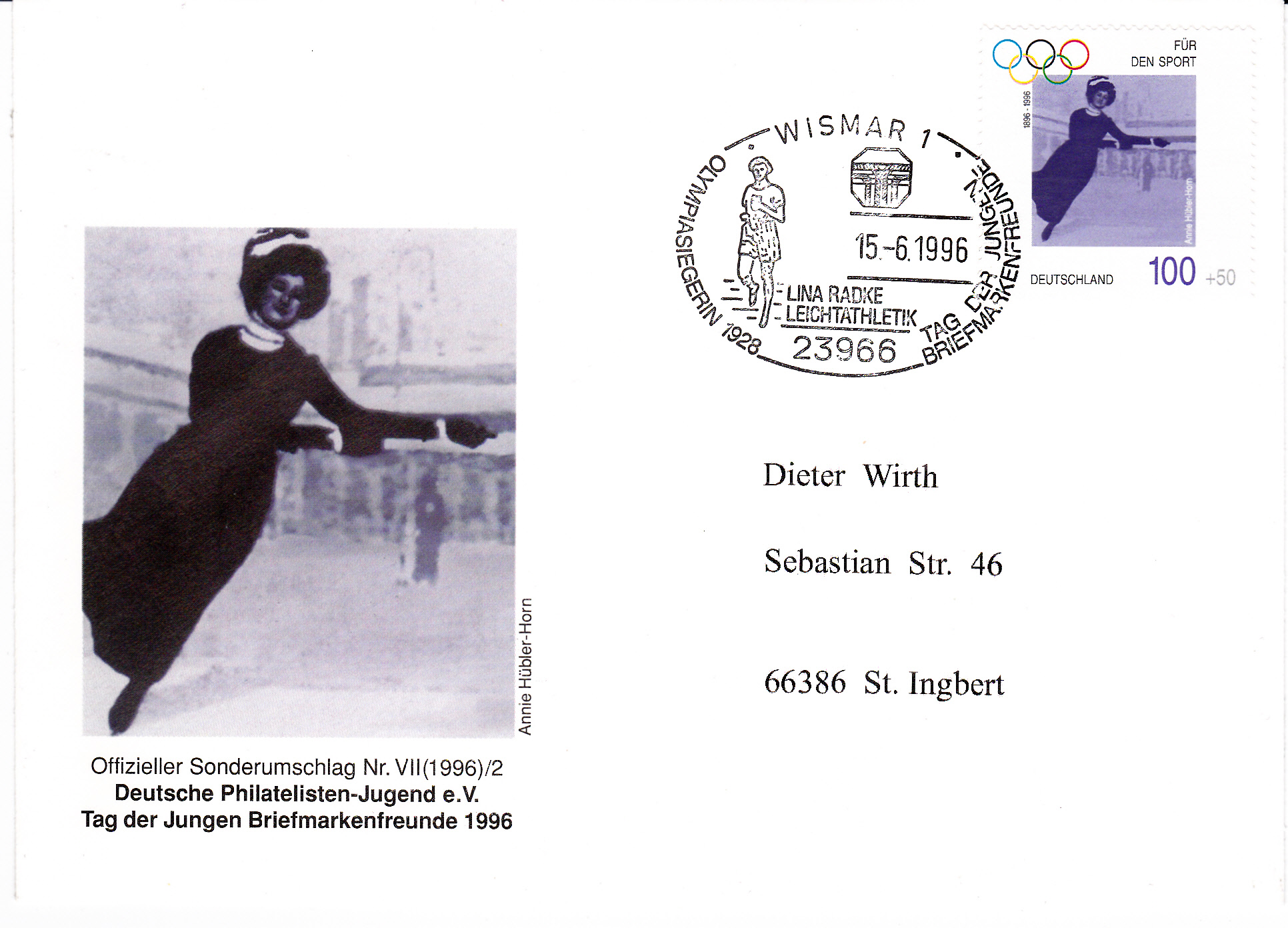Der Sonderstempel zum Tag der Jungen Briefmarkenfreunde vom 16.6.1996 aus Diepholz zeigt Hildegard Schrader im Stempelbild.