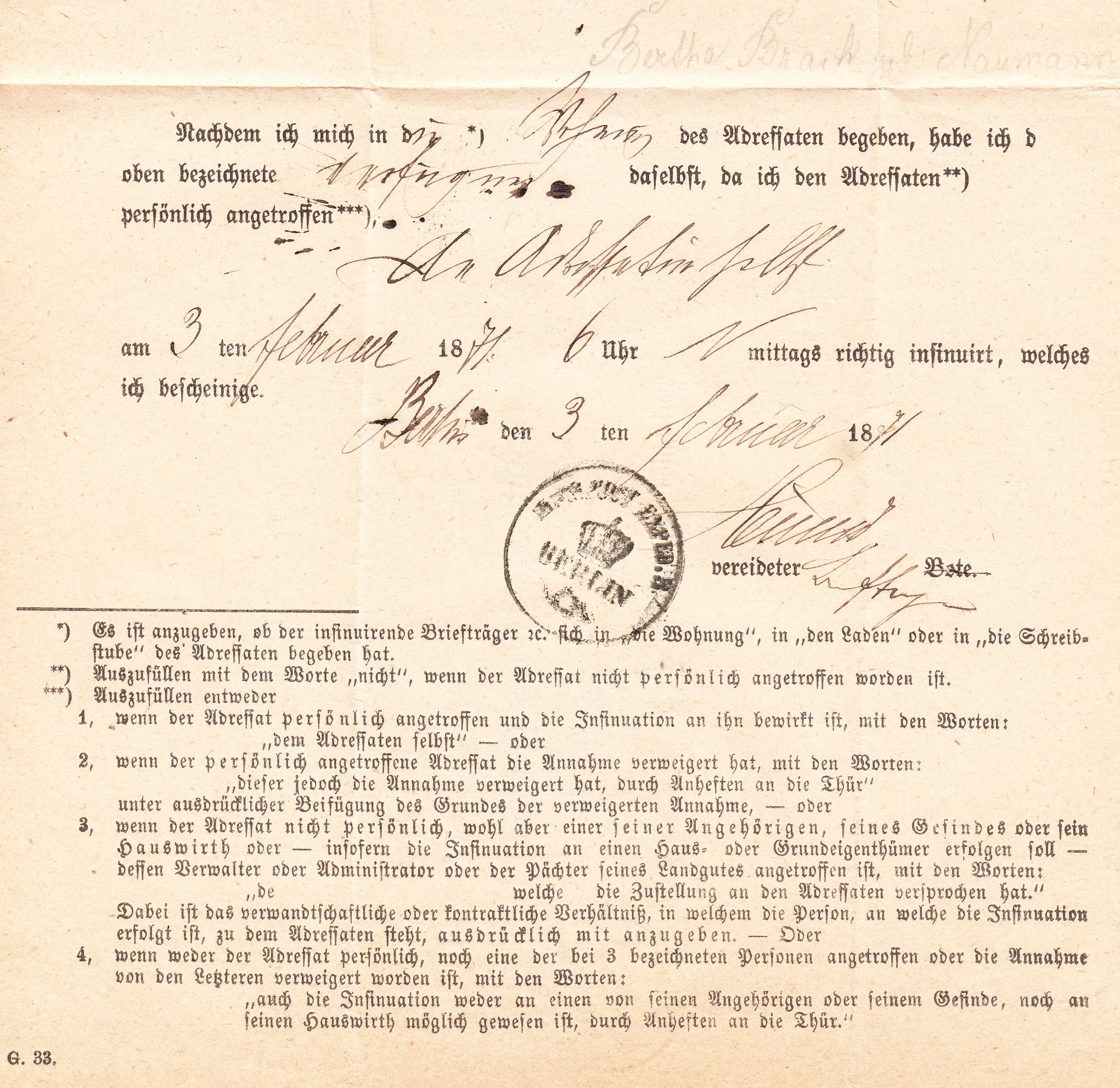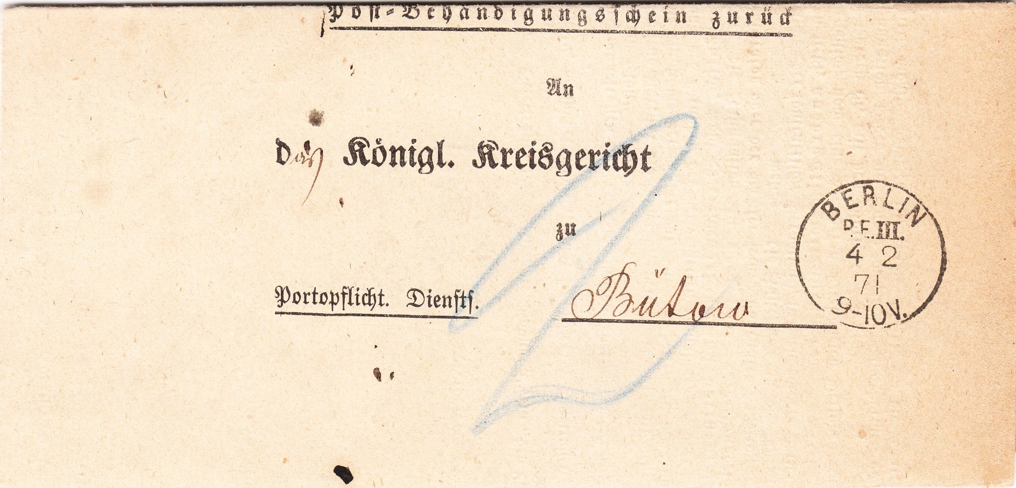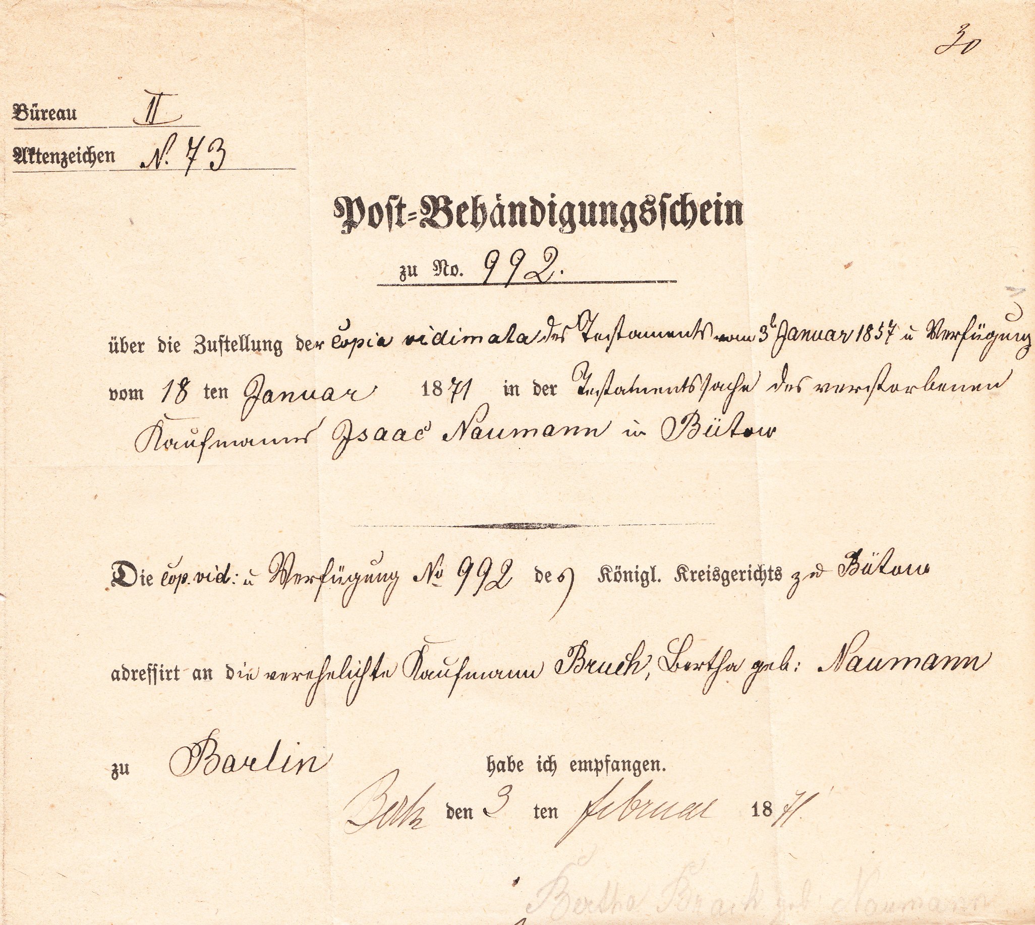 Dieser Postbehändigungsschein wurde nach erfolgter Zustellung am 04.02.1871 von der Postexpedition III. in Berlin an das Königliche Kreisgericht in Bütow geschickt: