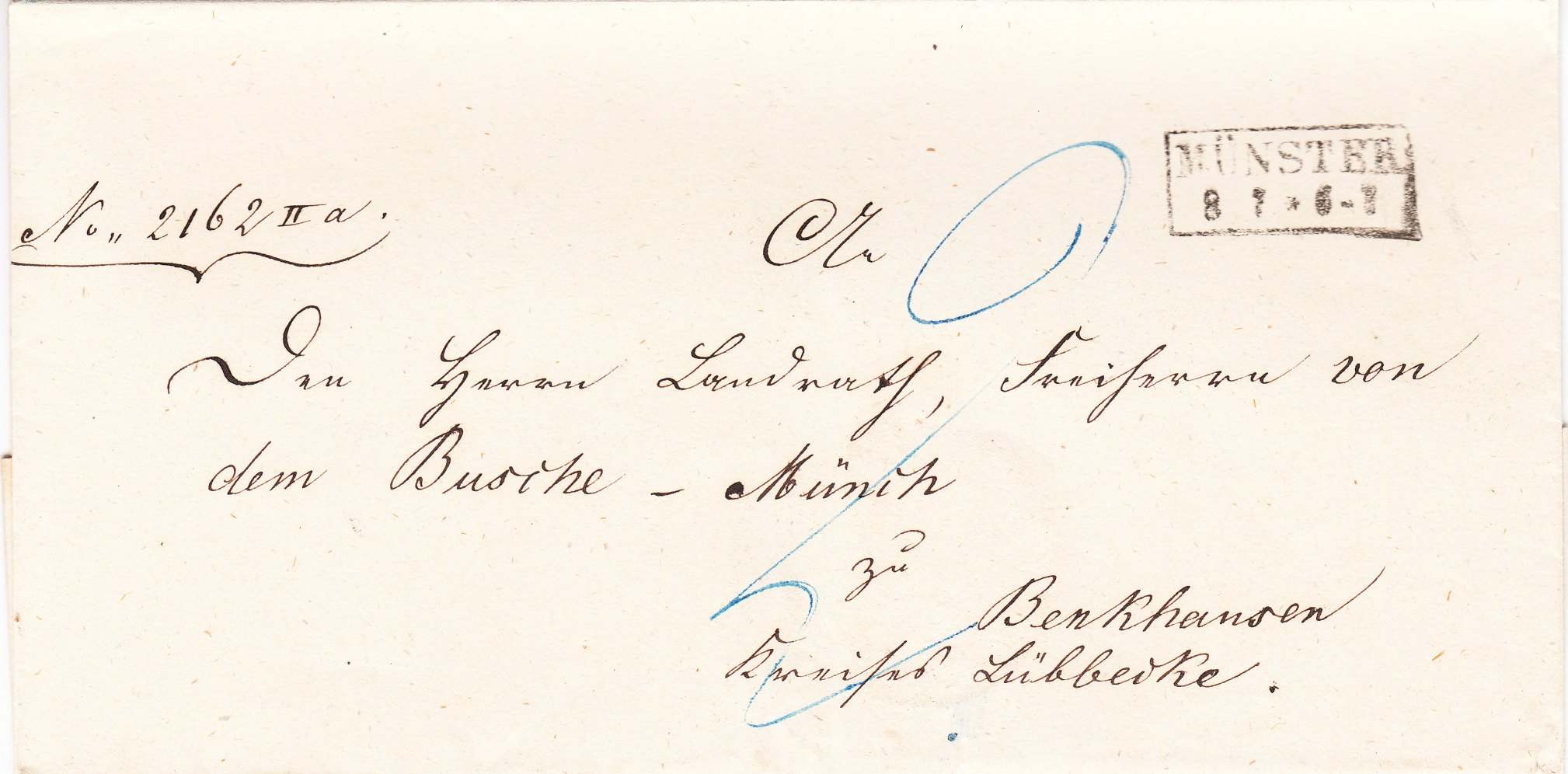 Diese "An den Herrn Landrath, Freiherr von dem Busche - Münch zu Benkhausen Kreises Lübbecke" adressierte Briefhülle wurde an einem 08.07. in Münster aufgegeben, was ein zweizeiliger Rahmenstempel dokumentiert, wie er in Preußen ab etwa 1847 in Gebrauch war: