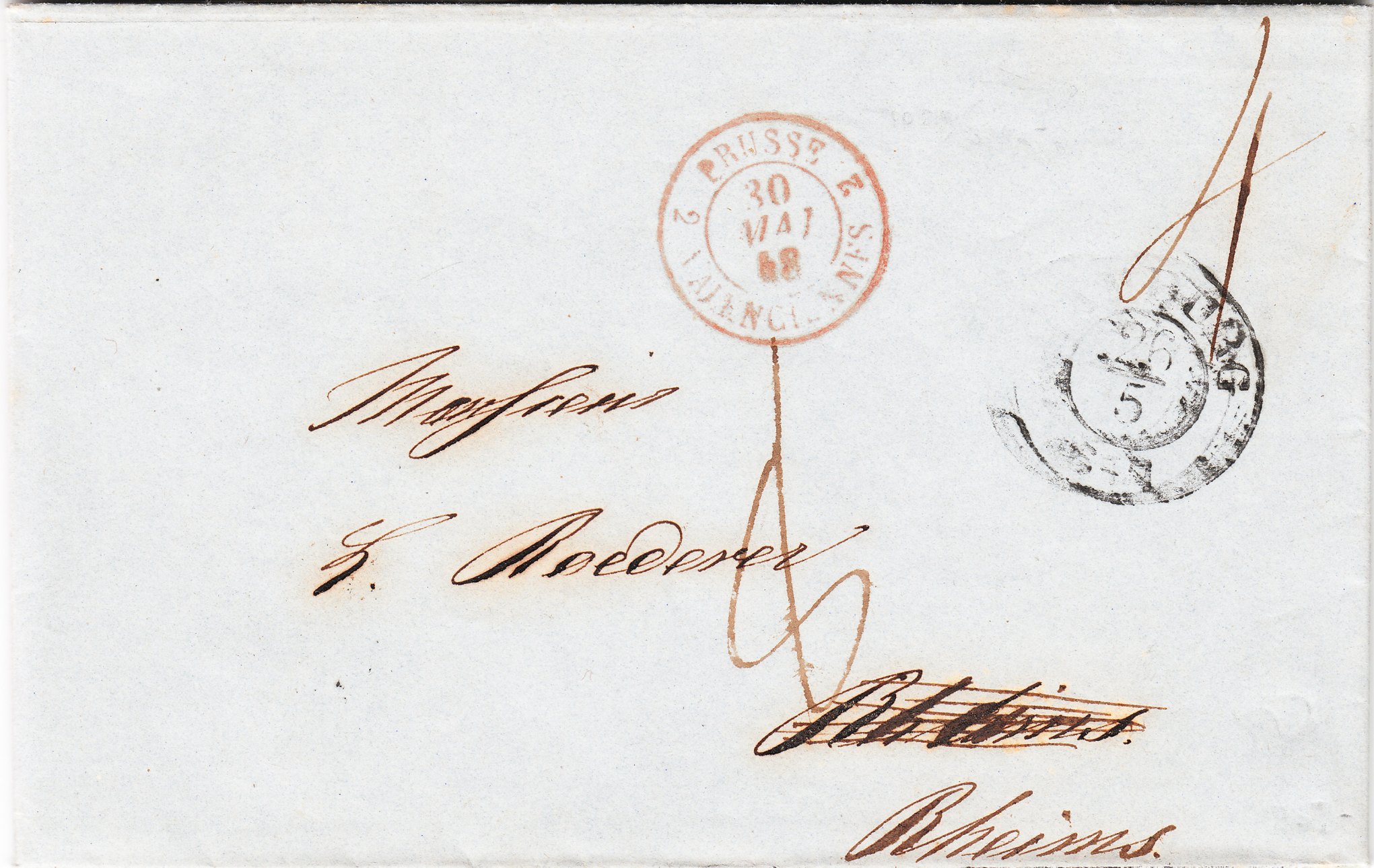 Am 30.05.1848 wurde im Grenzpostamt ein Zweikreisstempel "2 PRUSSE 2 VALENCIENNES 30 MAI 48" in Rot abgeschlagen.