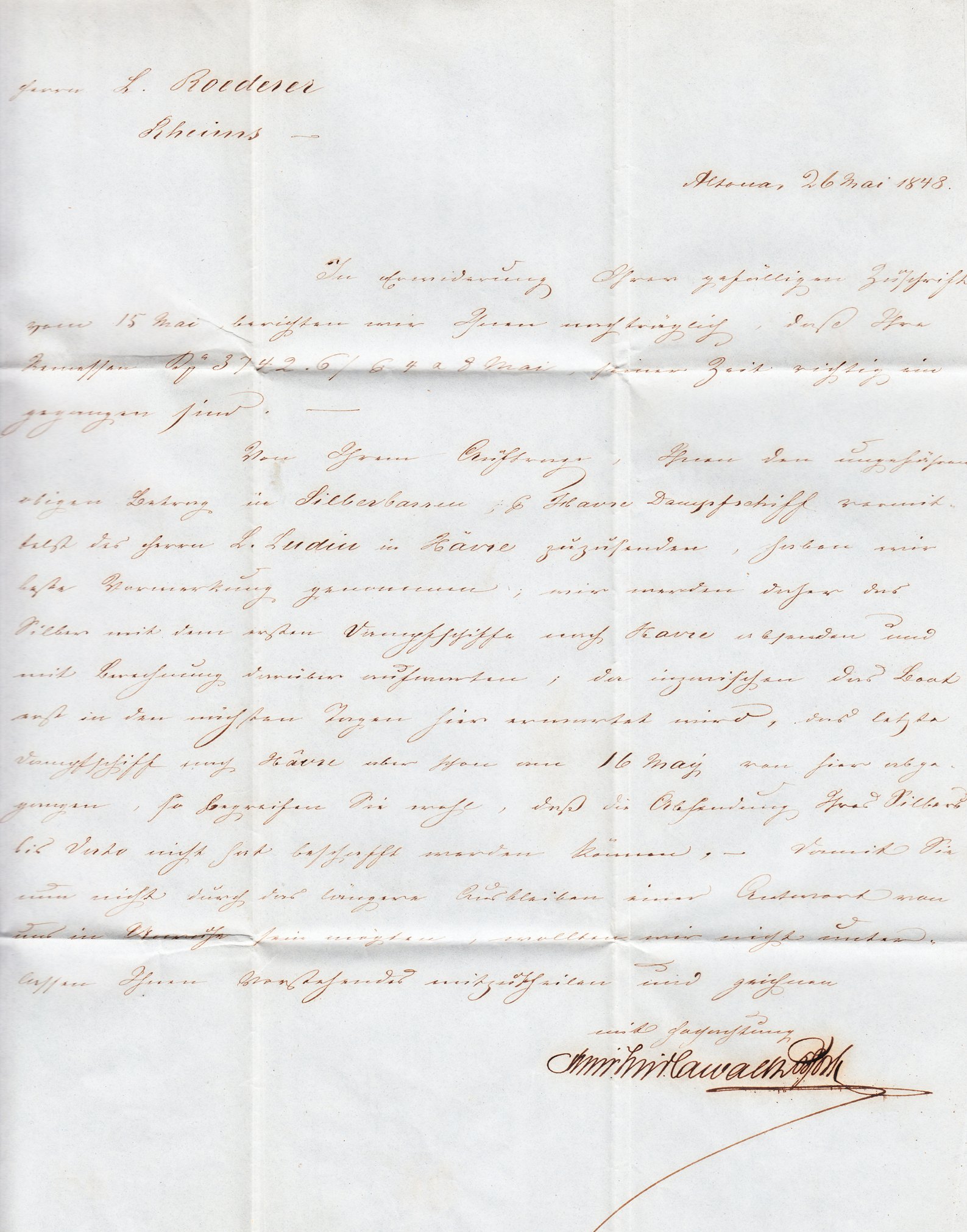 Dieser Brief wurde in Altona geschrieben und am 26.05.1848 beim Königlich Preußischen Oberpostamt in Hamburg aufgegeben, wo ein Zweikreisstempel "HAMBURG 26/5 6-7", Feuser 1353-5, abgeschlagen wurde: