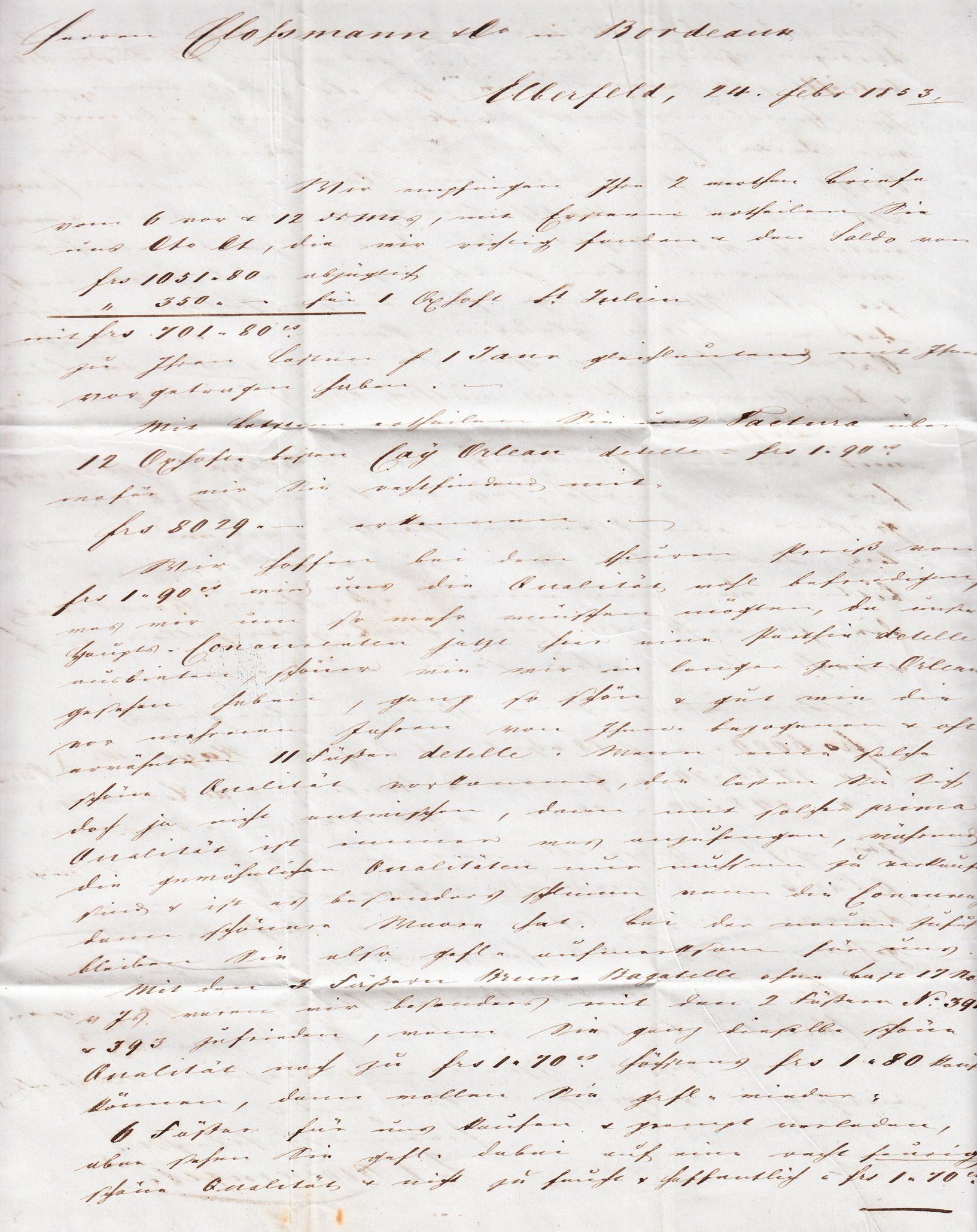Dieser nach Bordeaux adressierte Brief wurde am 24.02.1853 in ELBERFELD aufgegeben und dort mit einem zweizeiligen Rahmenstempel, Feuser 845-19, versehen: