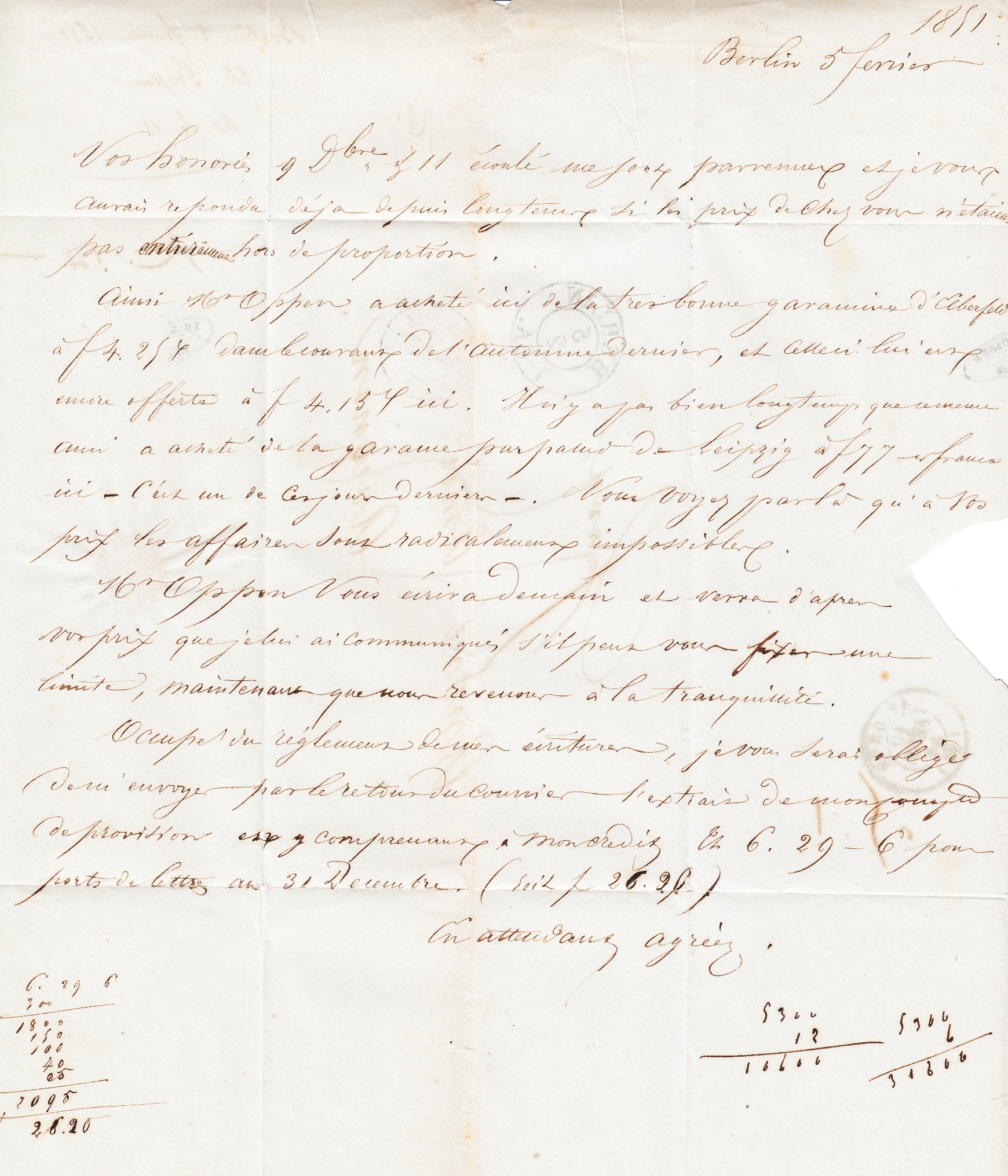 Dieser nach Avignon an "André Amic", einen Weinhändler, adressierte Brief wurde am 05.02.1851 in Berlin aufgegeben: