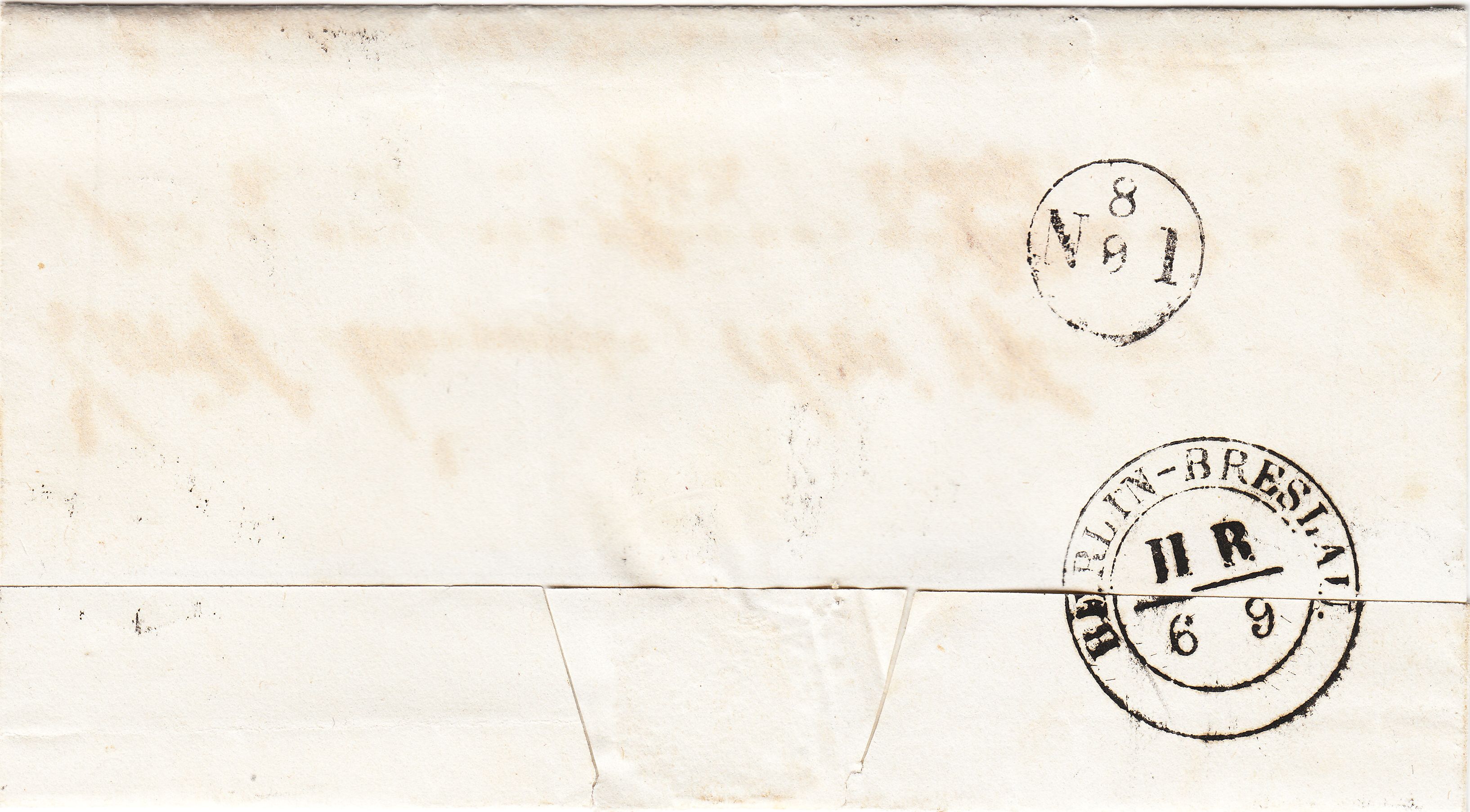 Interessant ist dieser Beleg, weil er auf der Rückseite den Abschlag eines preussischen Kursstempels der Bahnpost "BERLIN-BRESLAU II R 6 9" trägt: