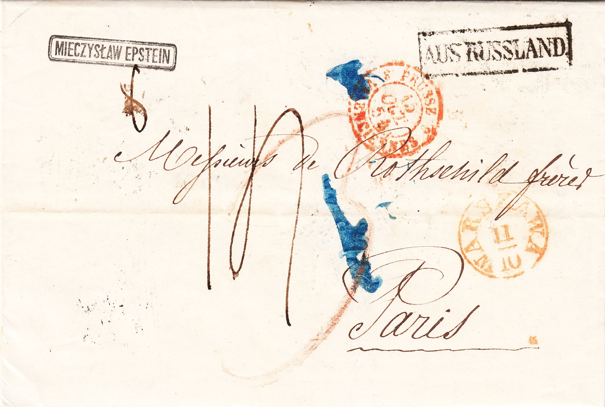 Dieser laut Absenderstempel von dem Warschauer Bankier Mieczysław Epstein an die Gebrüder Rothschild in Paris adressierte Brief wurde am 11.10.1854 in "WARZSAWA" = Warschau aufgegeben: