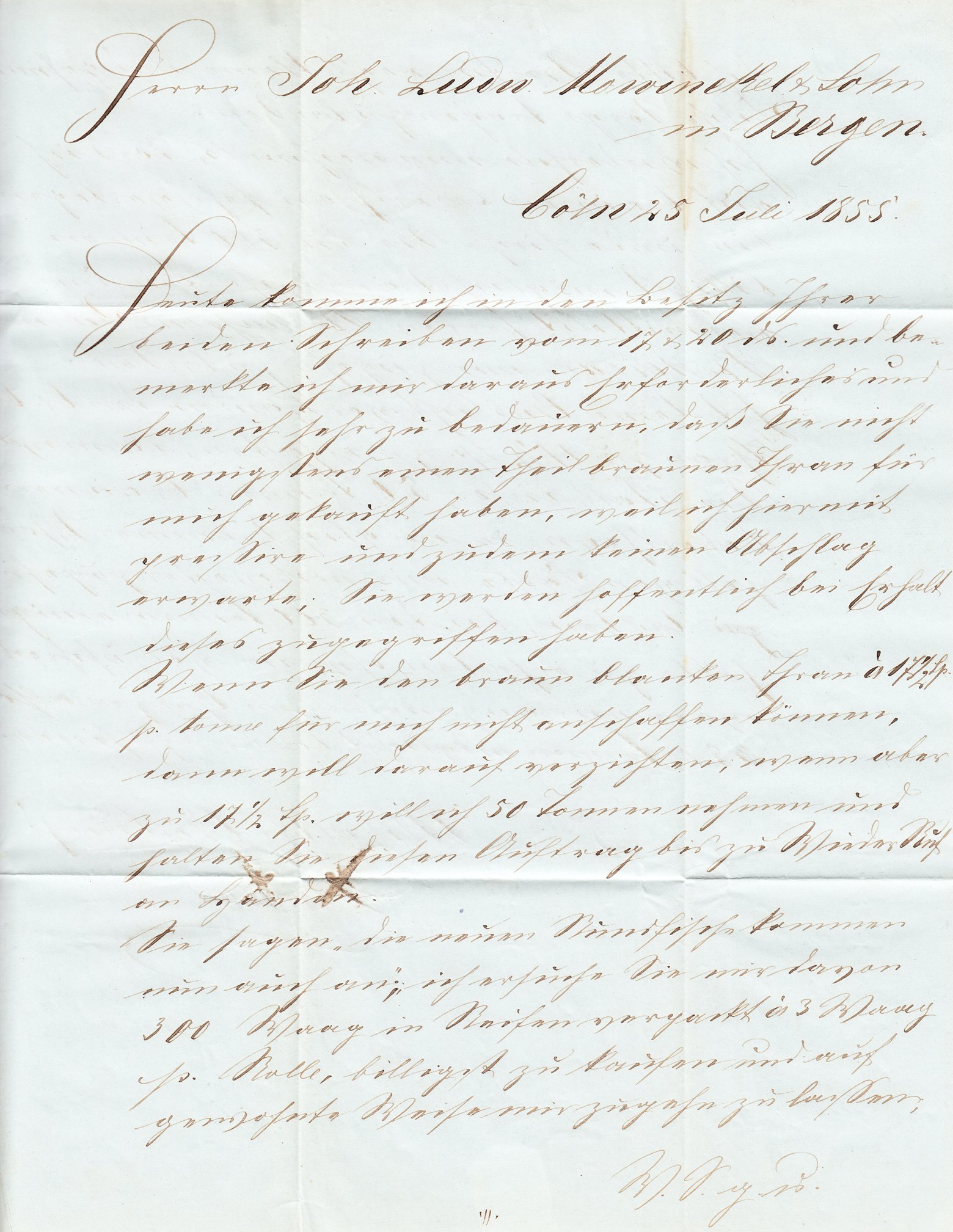 Dieser nach Bergen in Norwegen adressierte Brief wurde am 25.07.1855 in DEUTZ aufgegeben:
