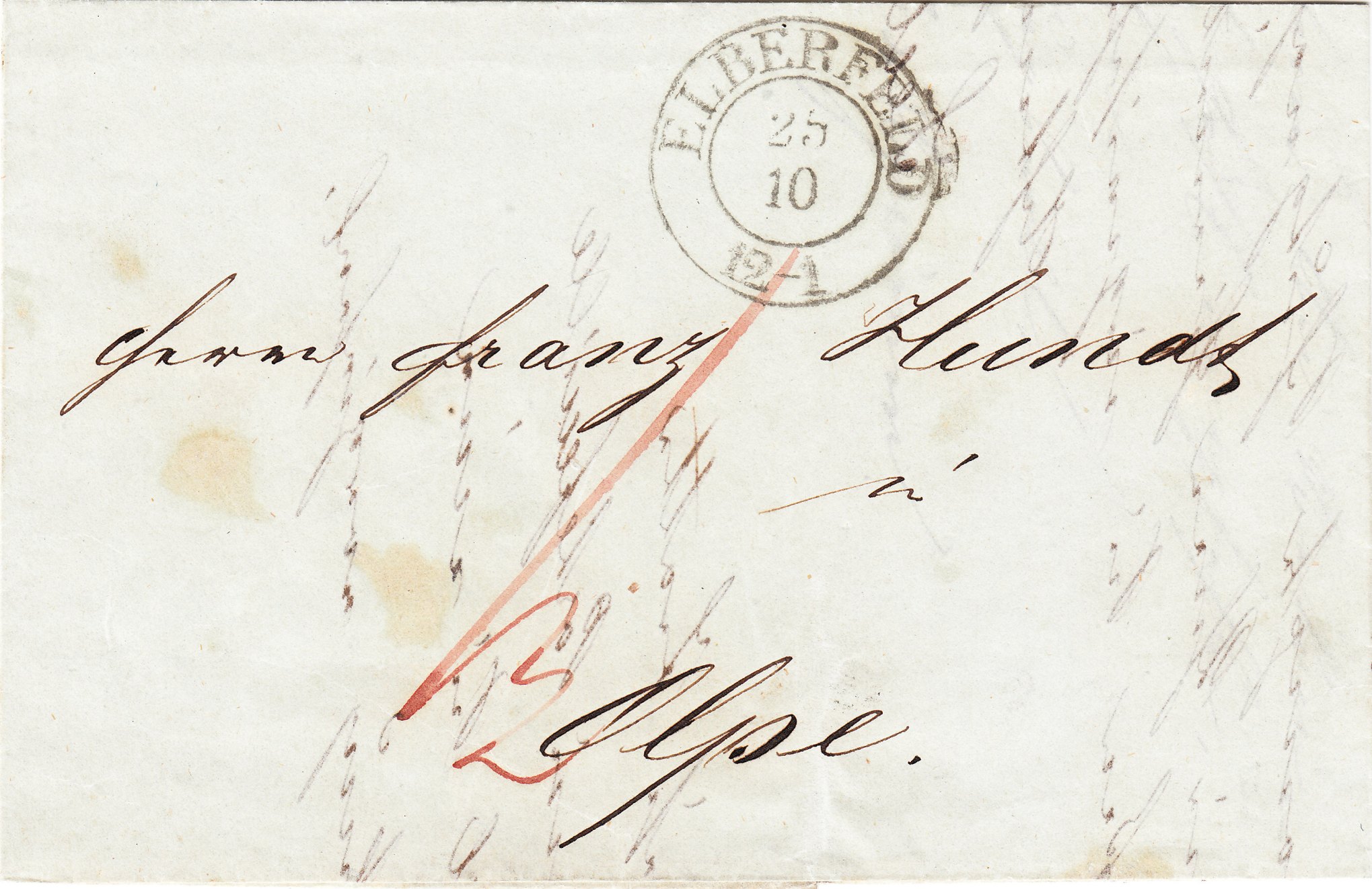 Dieser an "Herrn Franz Hundt in Olpe" adressierte Brief wurde am 25.10.1845 in "ELBERFELD" um "12-1" Uhr mittags aufgegeben, was ein Zweikreisstempel dokumentiert: