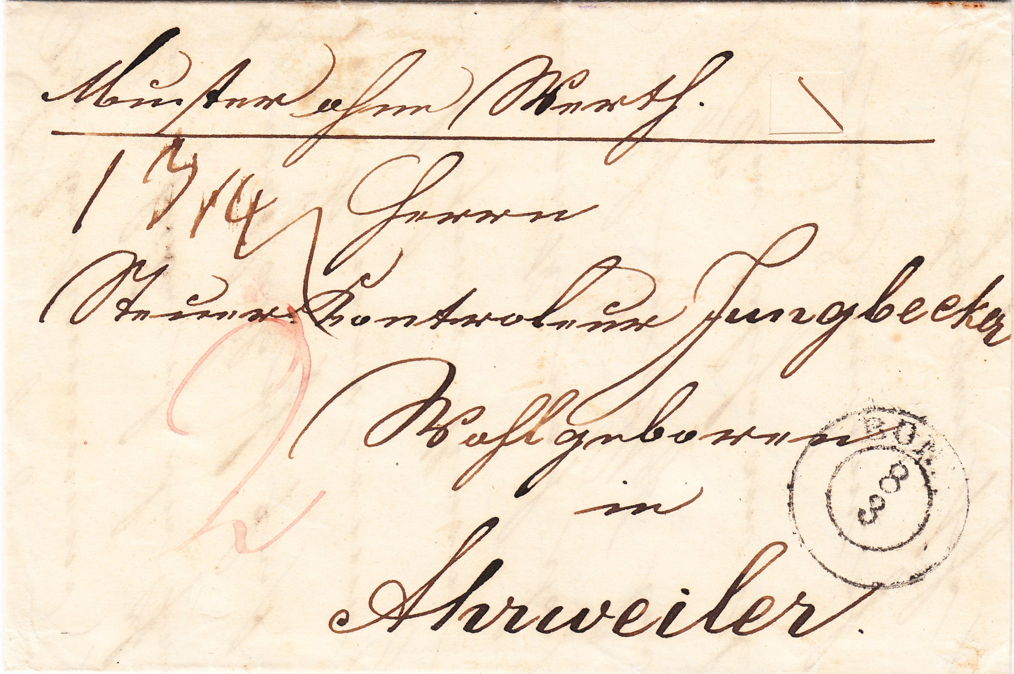 Elberfeld und Olpe sind Luftlinie 55 km voneinander entfernt, über die Straße sind es 72 km. Somit fiel der Beleg in die erste Entfernungsstufe bis 10 preußische Meilen = 75,325 km und kostete ein Porto von "1" Silbergroschen.
