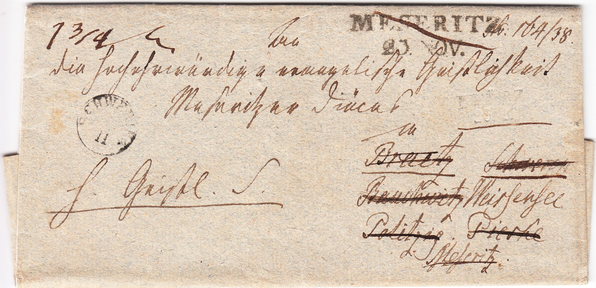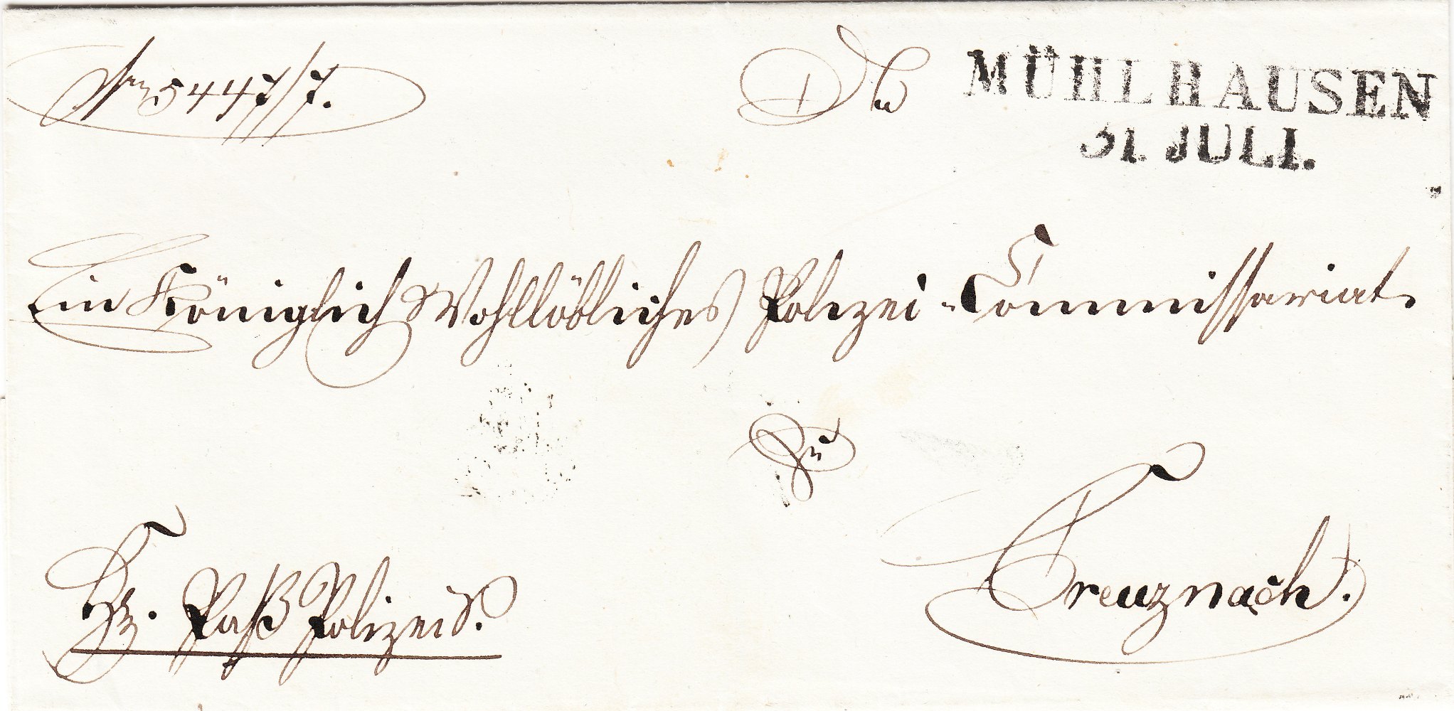 Diese "An die Großherzoglich Oldenburgische Regierung zu Birkenfeld" adressierte portofreie Polizeisache wurde an einem "31.12." in "COBLENZ" aufgegeben: