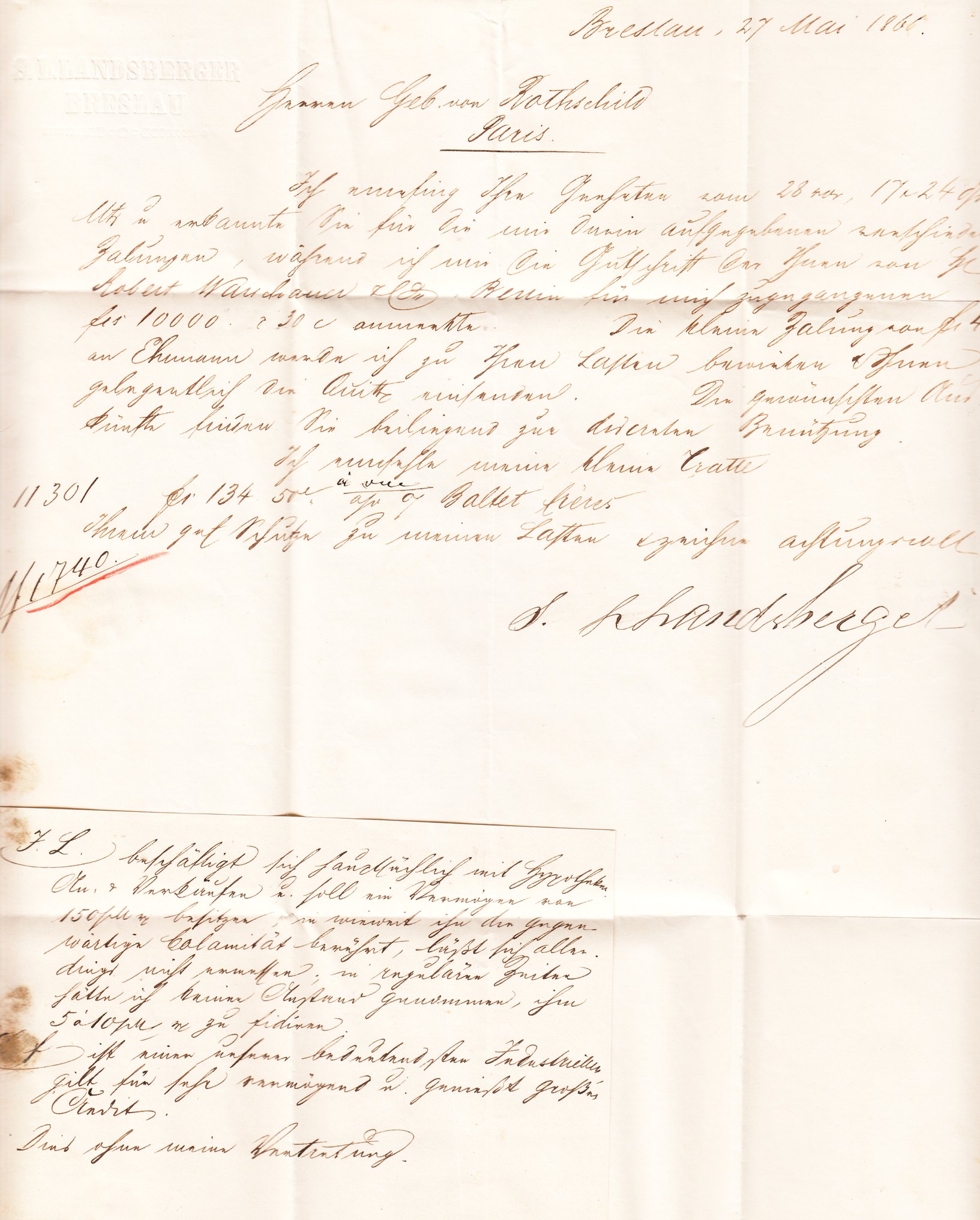 Dieser an die "Herren Gebrüder von Rothschild" in Paris adressierte Brief wurde am 27.05.1866 in BRESLAU als Frankobrief freigemacht mit "4 1/2" Silbergroschen aufgegeben, worauf ein einzeiliger Rahmenstempel "P.D." = Payé Destination in Rot hinweist: