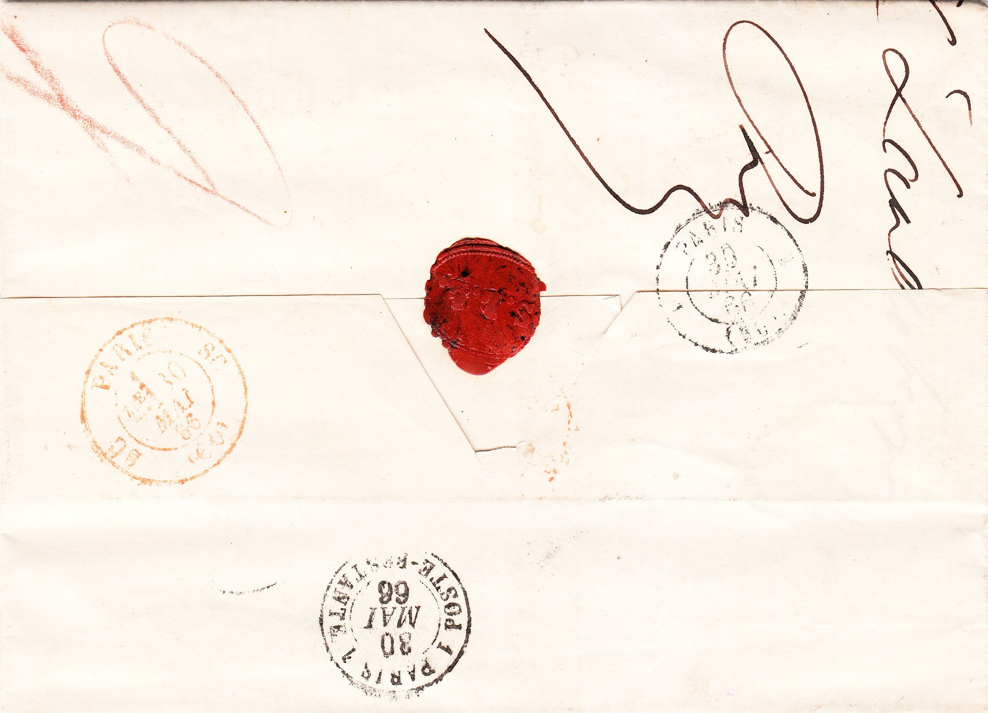Rückseitig finden sich drei verschiedene Stempel aus Paris vom 30.05.1866, dabei ein Postlagerstempel = "POSTE RESTANTE":