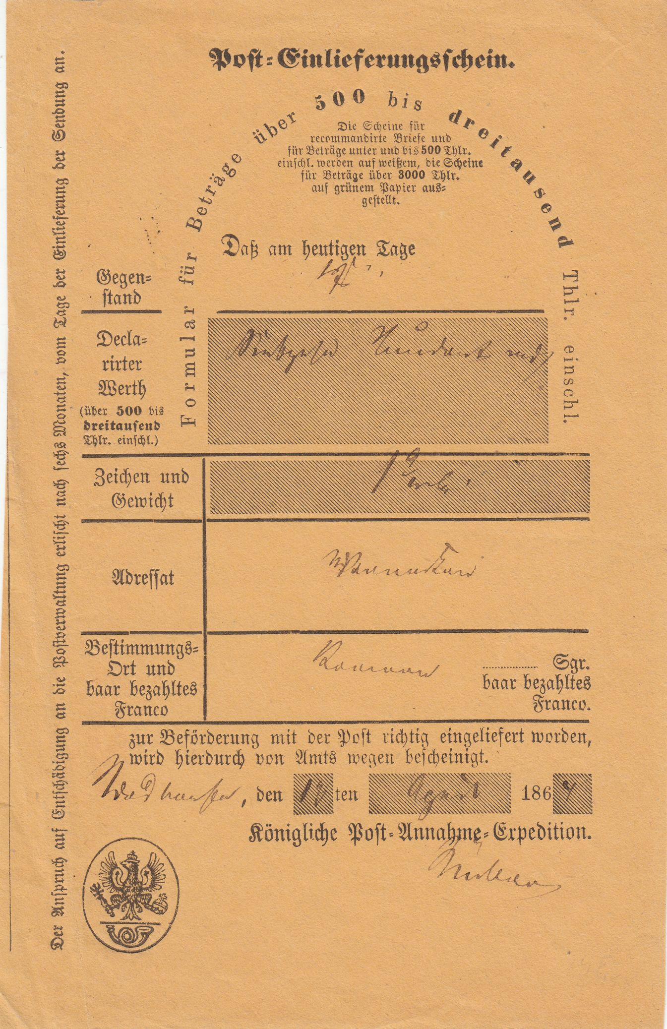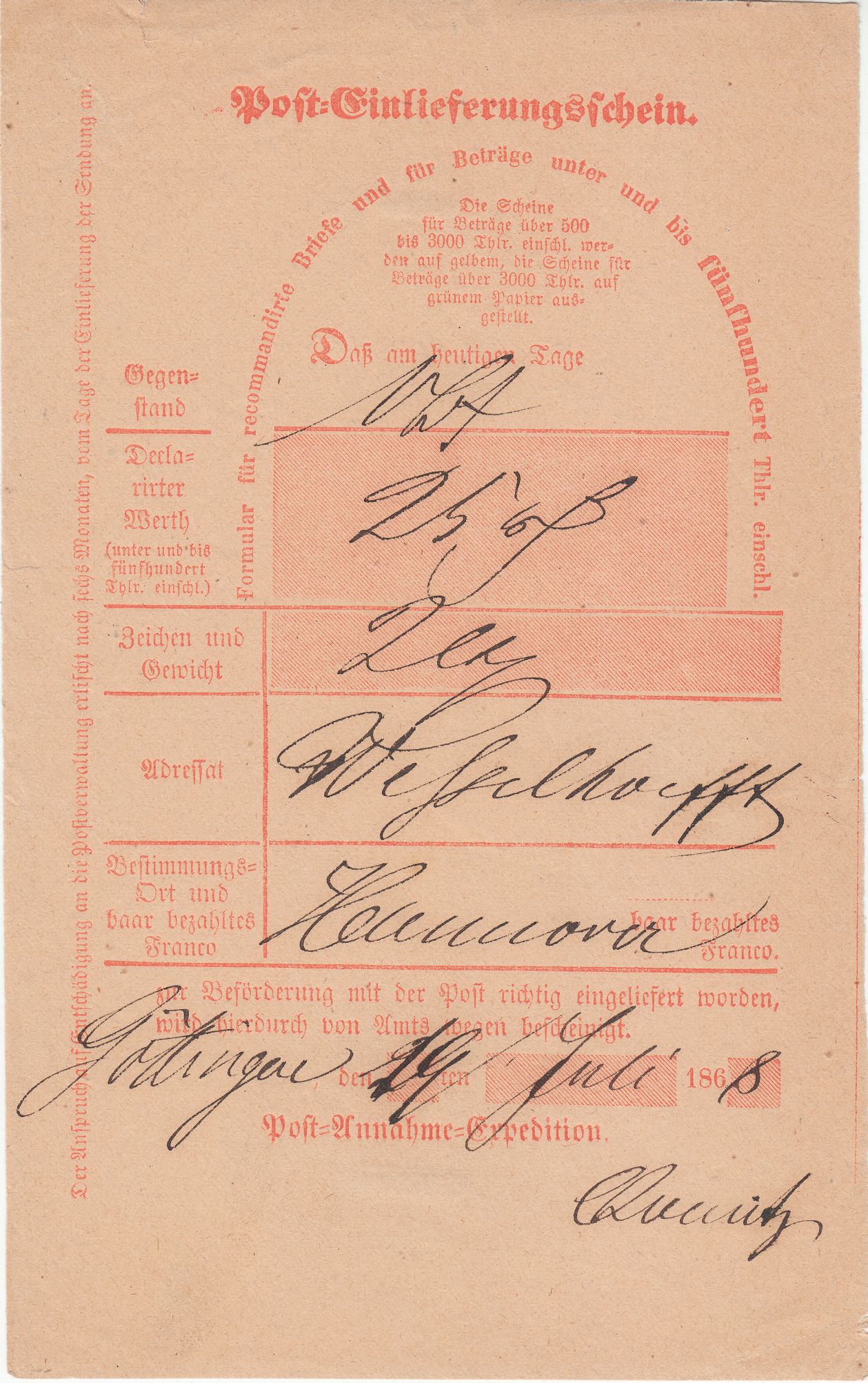Hier ein Post-Einlieferungsschein "bis fünfhundert Thlr. einschl.", der am 19.07.1868 in Göttingen ausgestellt wurde: