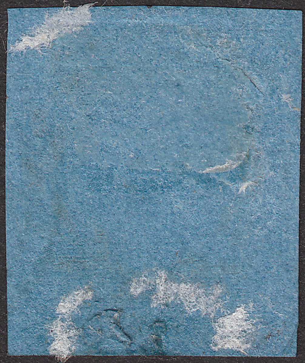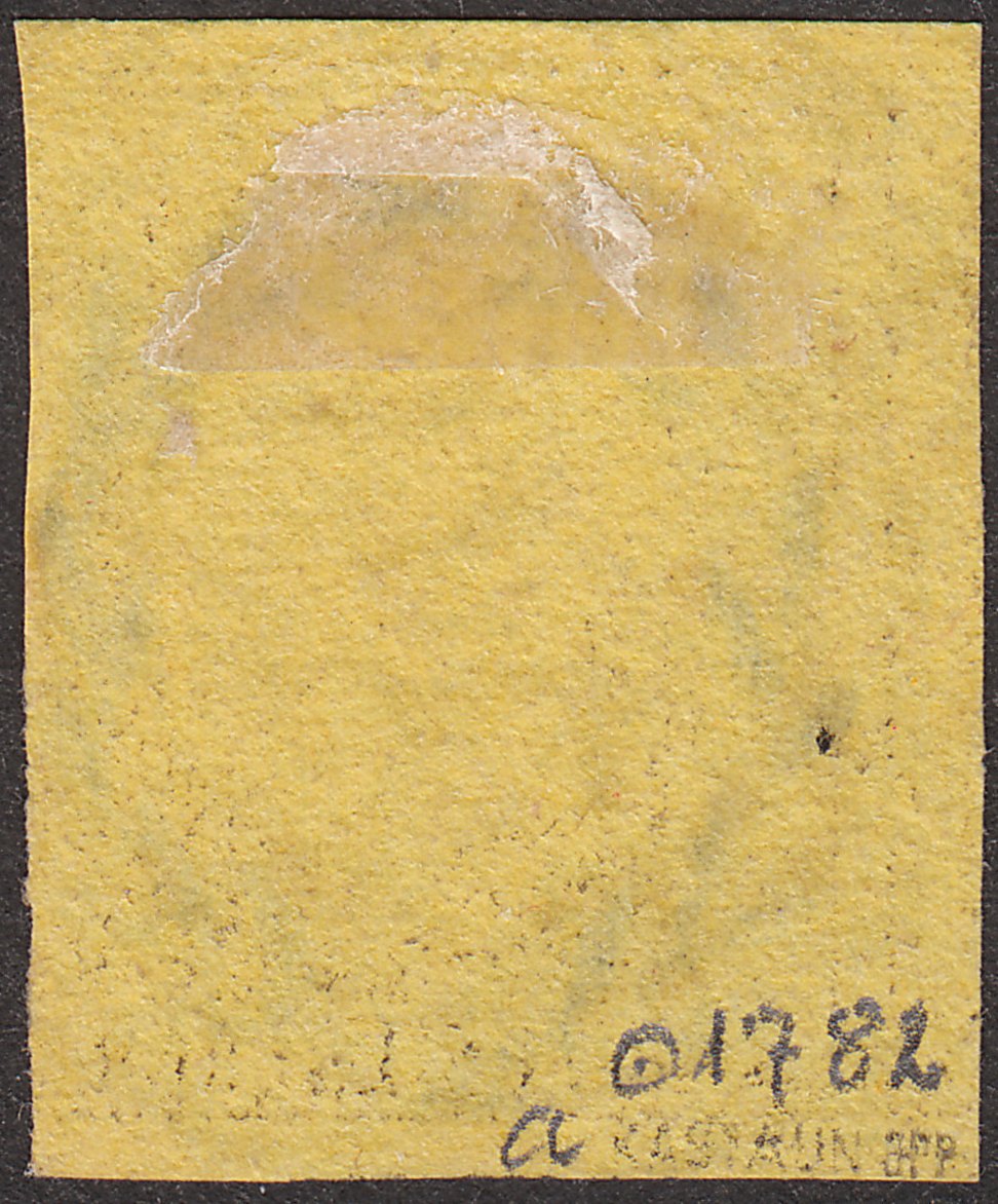 Die Marke weist leider sowohl rechts unter dem Falz als auch über dem "B" des Stempels dünne Stellen auf, ist also dort, wie man bei altdeutschen Marken sagt, "hell"!