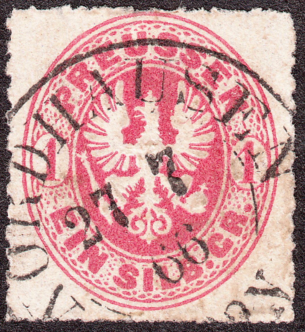 Interessant ist die MiNr. 24, die auf einem Briefstück erhalten ist und mit einem Zweikreisstempel "HILDBURGHAUSEN 15 9 1867" entwertet wurde: