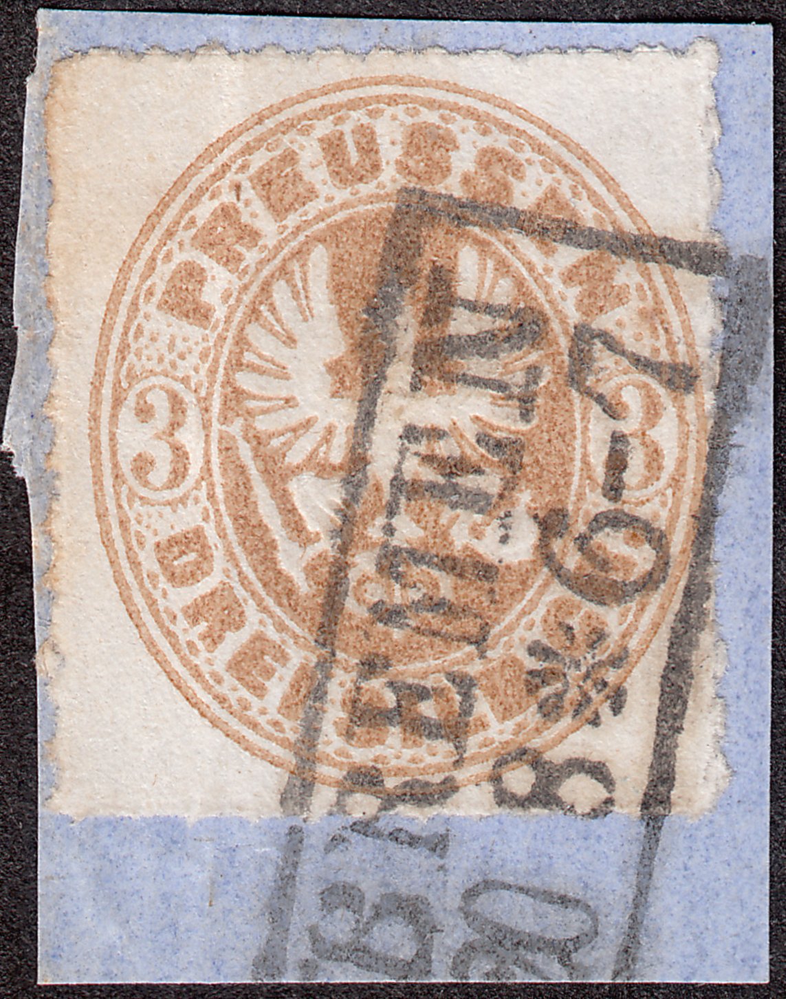 So hat er bei dieser Marke dem bremischen Stempel der Stadtpost zur Entwertung der preussischen Marke benutzt, der dem preussischen Rahmenstempel sehr ähnlich sieht, dem jedoch der Zusatz zur Stundenangabe "VM" oder "NM" fehlt!