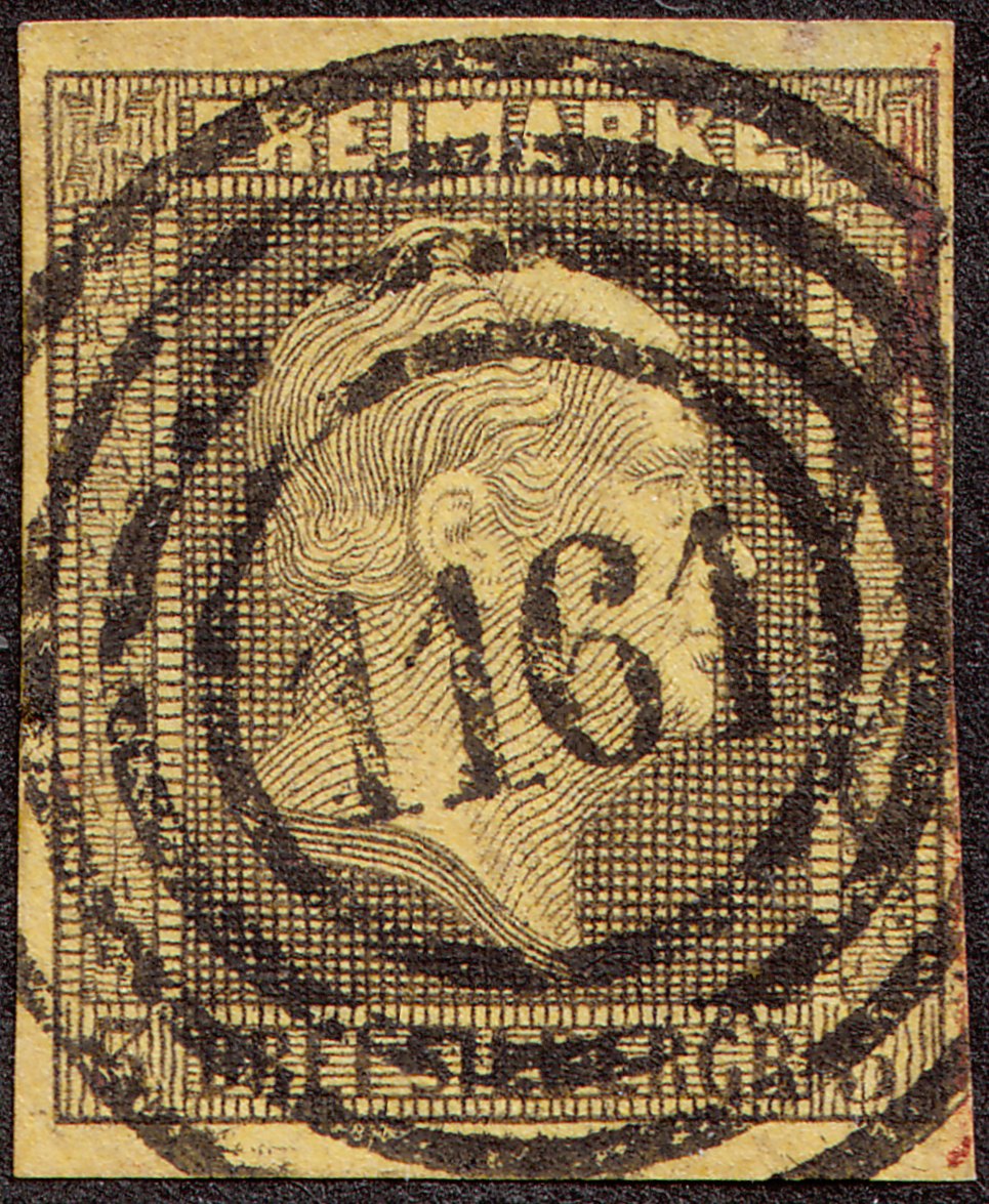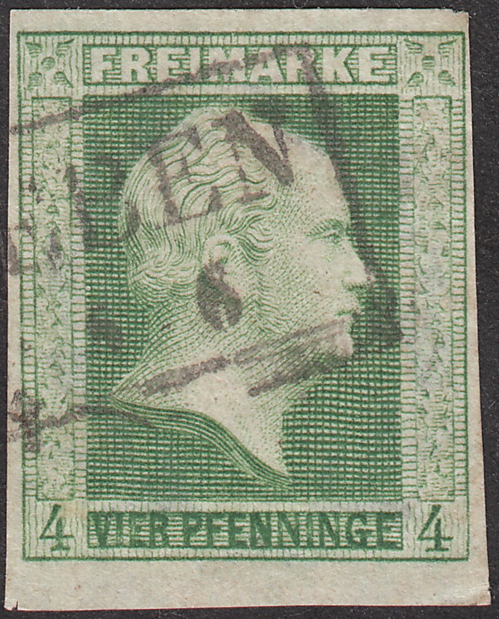 Es handelt sich um eine MiNr. 4 entwertet mit Vierringstempel "1161" = Prenzlau.