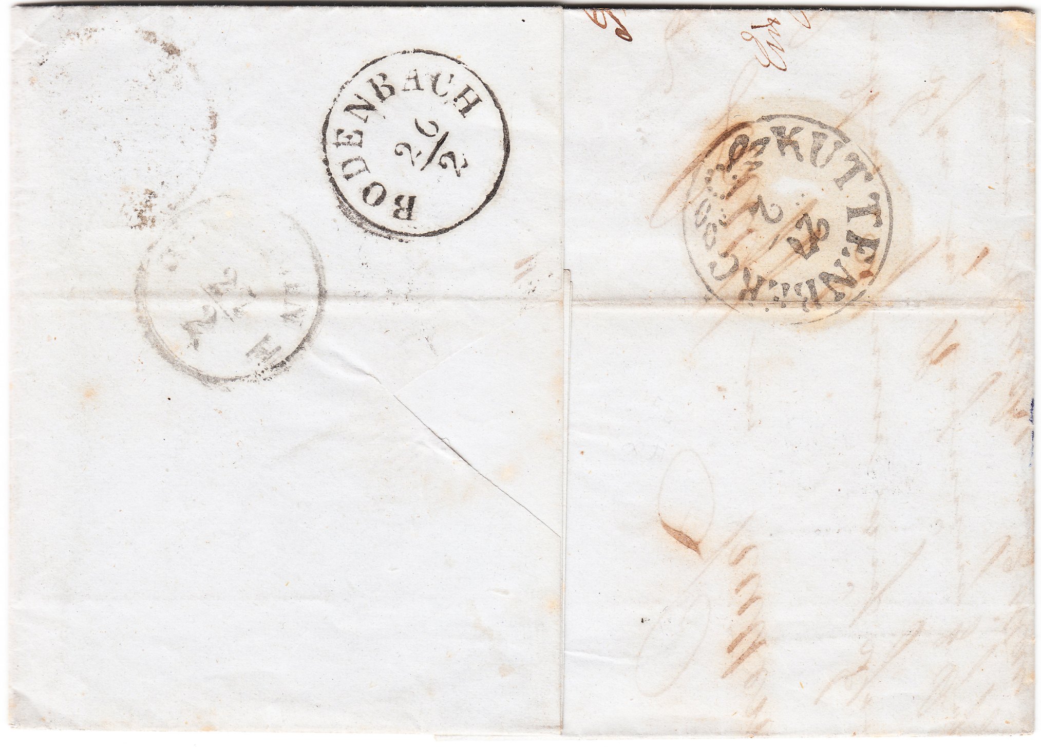 Der Brief ist adressiert nach "Eybau" gleich dem heutigen Eibau. Dieses liegt im Landkreis Bautzen, weshalb der Beleg am 02.03.1864 rückseitig einen Zweikreisstempel "BAUTZEN 2 MRZ. 64" als Durchgangsstempel erhielt.