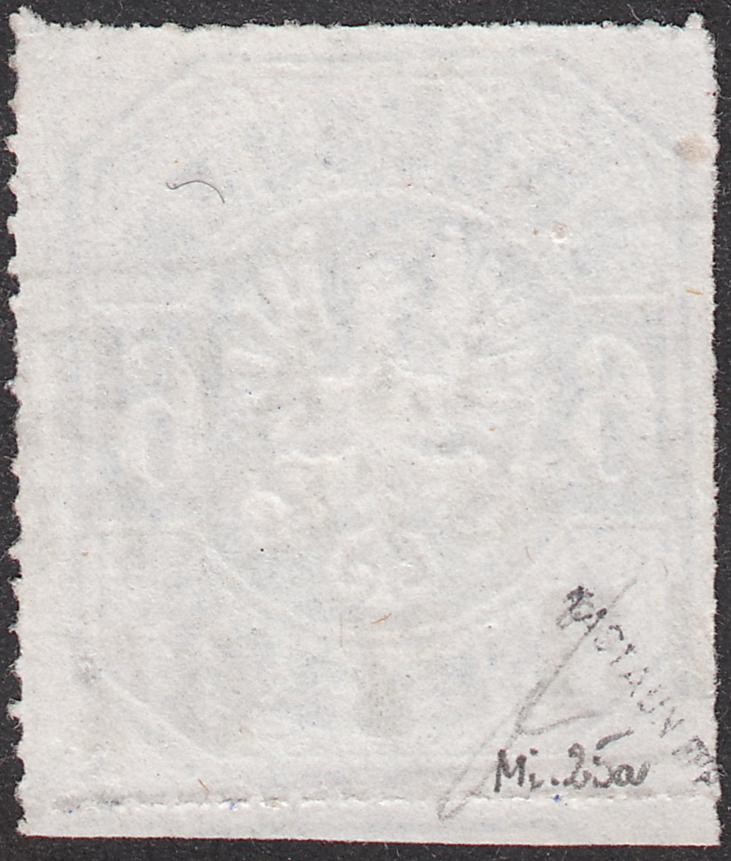 Der ehemalige Bundesprüfer Kastaun hat das Stück als MiNr. "25a" geprüft und seinen Prüferstempel direkt an den unteren Markenrand gesetzt, was bedeutet, daß diese Marke ohne jeglichen Mangel ist.