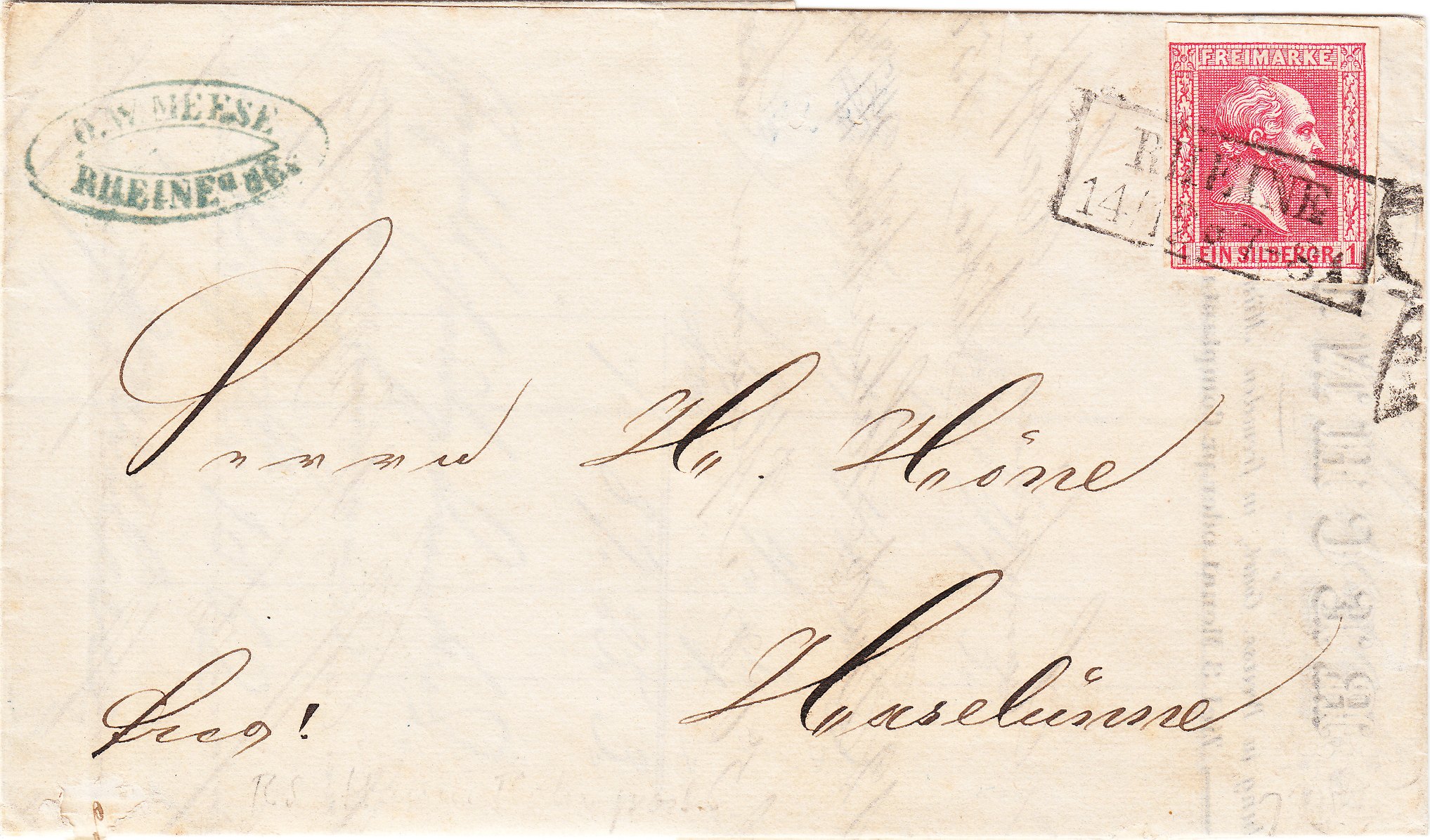 Dieser Brief wurde am 14.12.1861 in "RHEINE" aufgegeben und die Frankatur, eine MiNr. 10, wurde per Rahmenstempel mit Stundenangabe "7-8" entwertet.