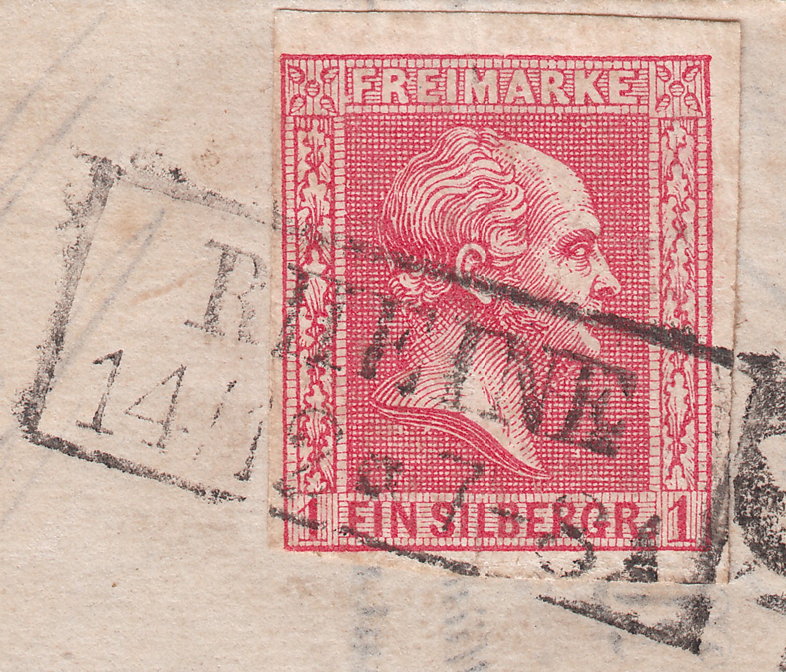 Dieser Brief wurde am 14.12.1861 in "RHEINE" aufgegeben und die Frankatur, eine MiNr. 10, wurde per Rahmenstempel mit Stundenangabe "7-8" entwertet.