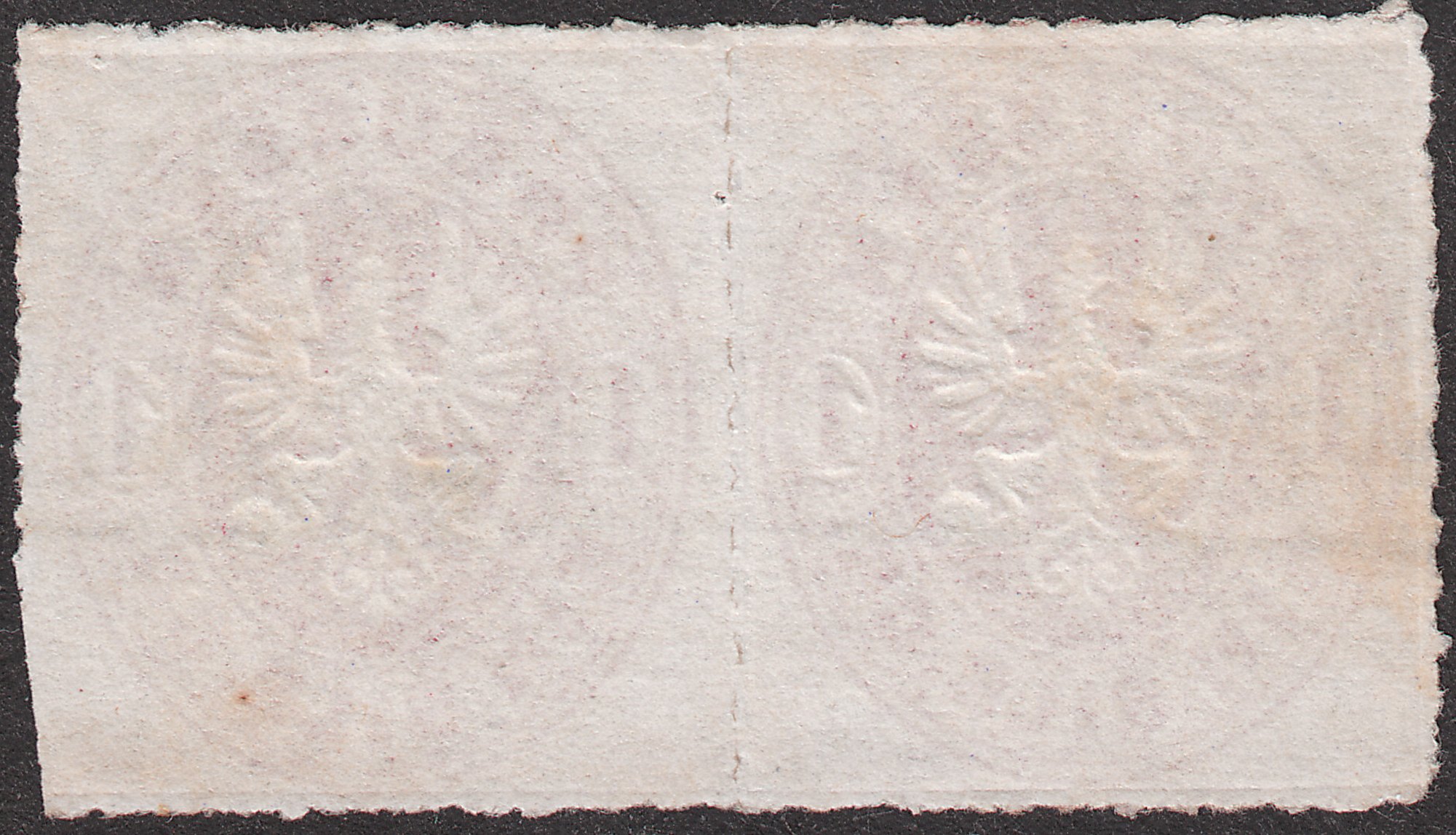 Dieses Paar der MiNr. 16 wurde entwertet in "KOENIGSBERG PR" per Doppelkreisbogenstempel "EISENB. POST-BUR." = Eisenbahn Post-Bureau: