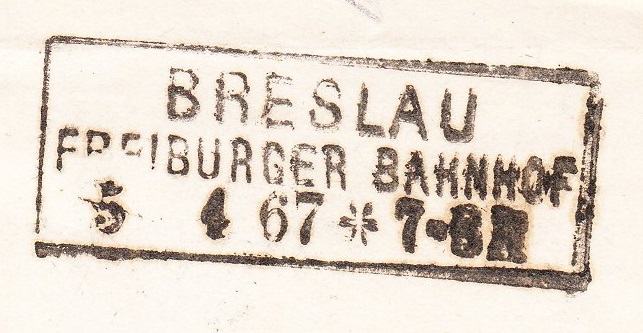 Der Rahmenstempel "BRESLAU FREIBURGER BAHNHOF" zeigt einen ungewöhnlich weiten Abstand zwischen der Tagesangabe "5" und der Monatsangabe "4".