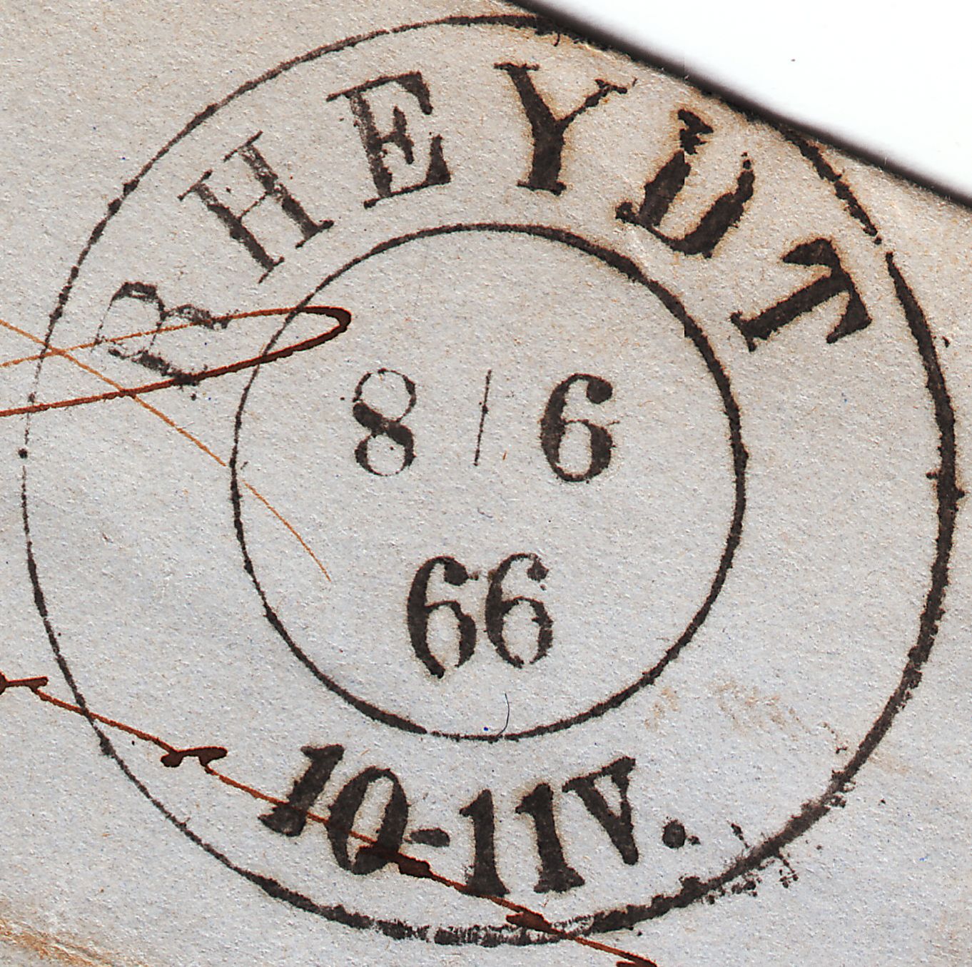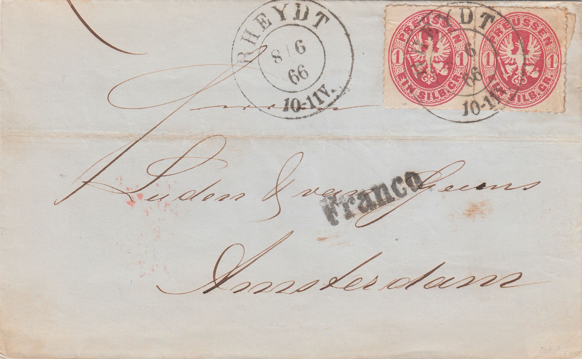 Dieser nach Amsterdam adressierte Brief wurde am 08.06.1866 in Rheydt aufgegeben, frankiert mit einem Paar der MiNr. 16 zur Abdeckung des Portos von 2 Silbergroschen: