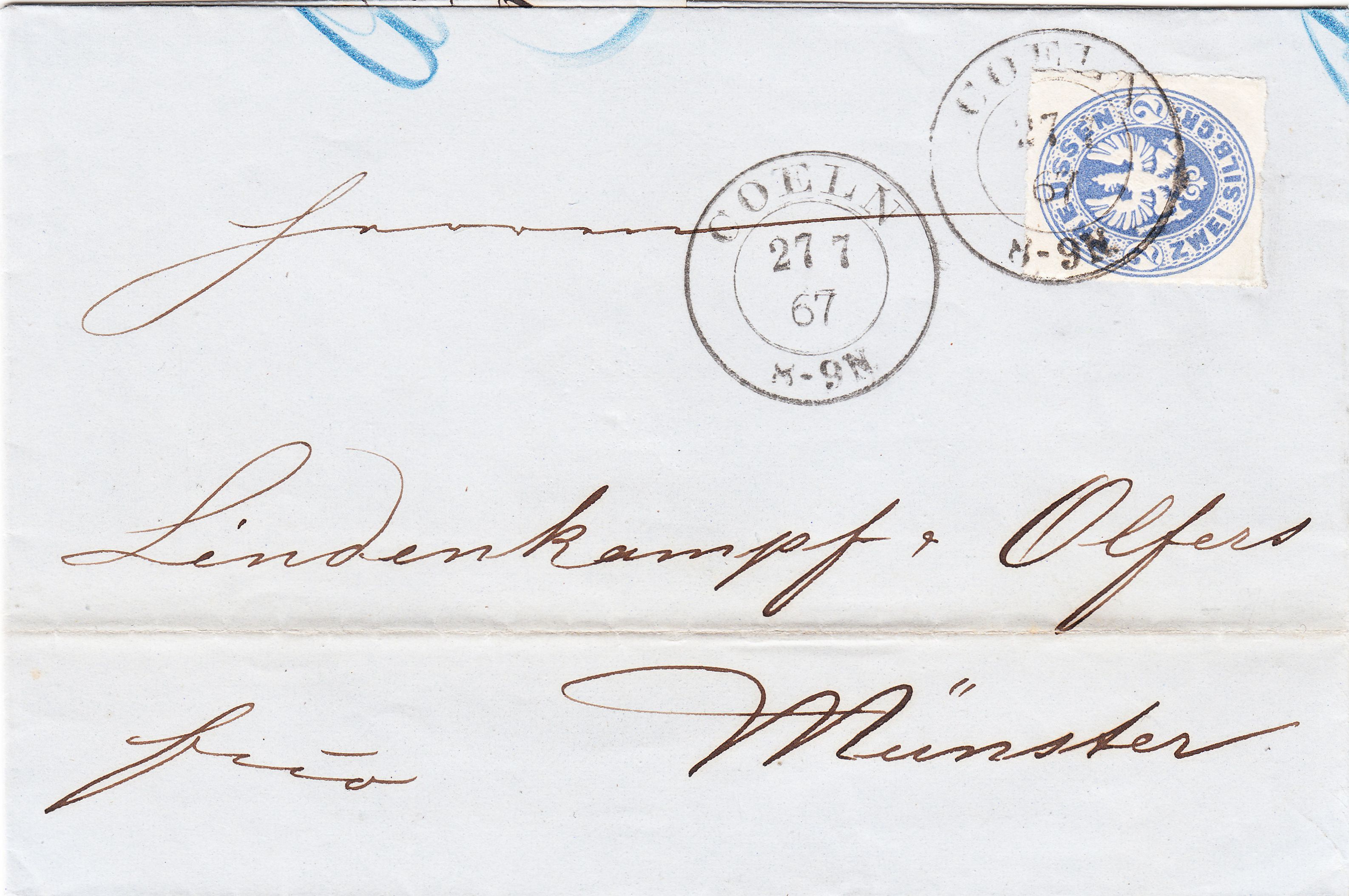 Diesen Brief mit einer Einzelfrankatur der MiNr. 17 II auf Brief von Köln nach Münster habe ich auf der Messe in Sindelfingen für 5 € erwerben können: